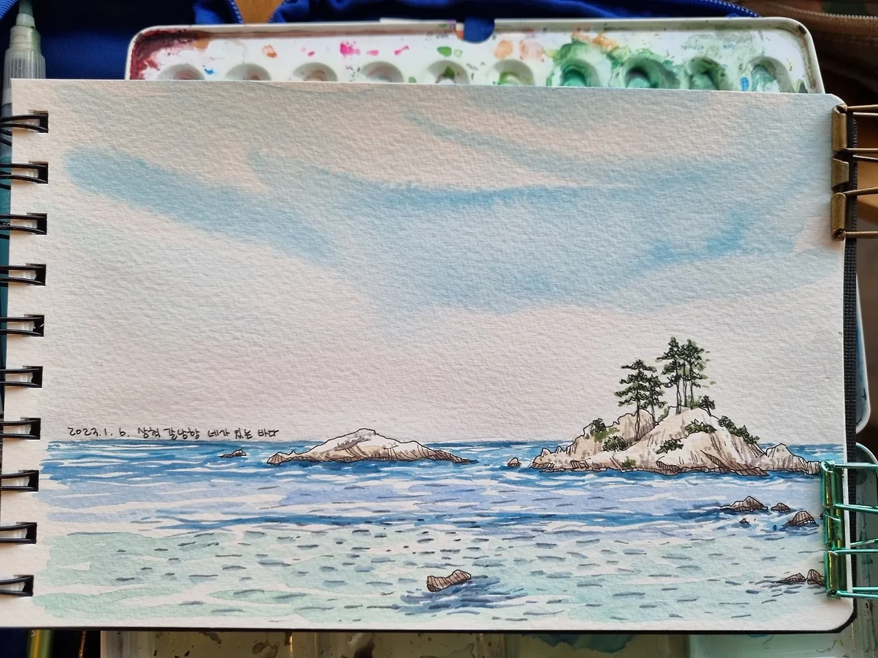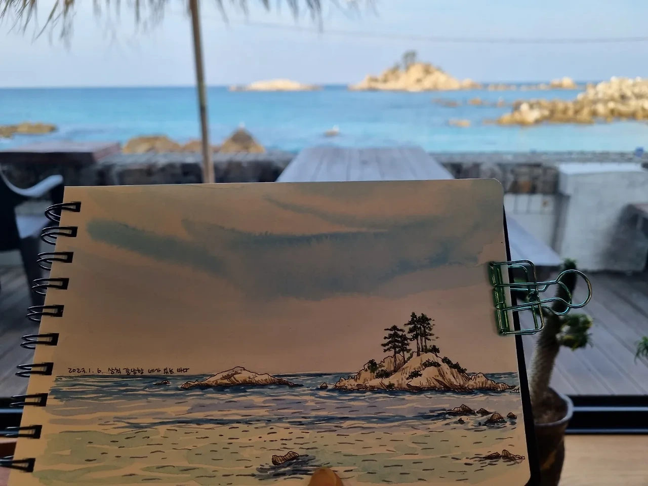 갈남항에서 구경을 하고 바로 그 옆 카페로 장소를 옮긴다. 여행 중 매일 카페를 들르는 게 우리 가족의 루틴이 된 지도 꽤 오래된 것 같다. 카페 문화가 워낙 발달해서 가보고 싶은 좋은 카페가 너무 많이 생기기도 했고, 온 가족이 자유롭게 시간을 보내면서 내가 어반스케치를 즐길 수 있는 공간은 카페 밖에 없기도 하다. 엄마가 한 시간 남짓 그림을 그리는 동안 딸아이도 주로 그림을 그리고, 남편과 아들은 패드나 노트북을 꺼낸다. 남편을 패드로 책을 읽거나 일을 하기도 하지만 아들은 주로 게임을 한다. 책을 한 권 들고 다니자고 잔소리를 무수히 해 보지만 한 두 장 읽고 나면 주로 게임을 한다. 엄마가 그림 그리는 시간을 아들이 기다려주는 것만으로도 고마워해야 할 일인 것 같긴 하다.