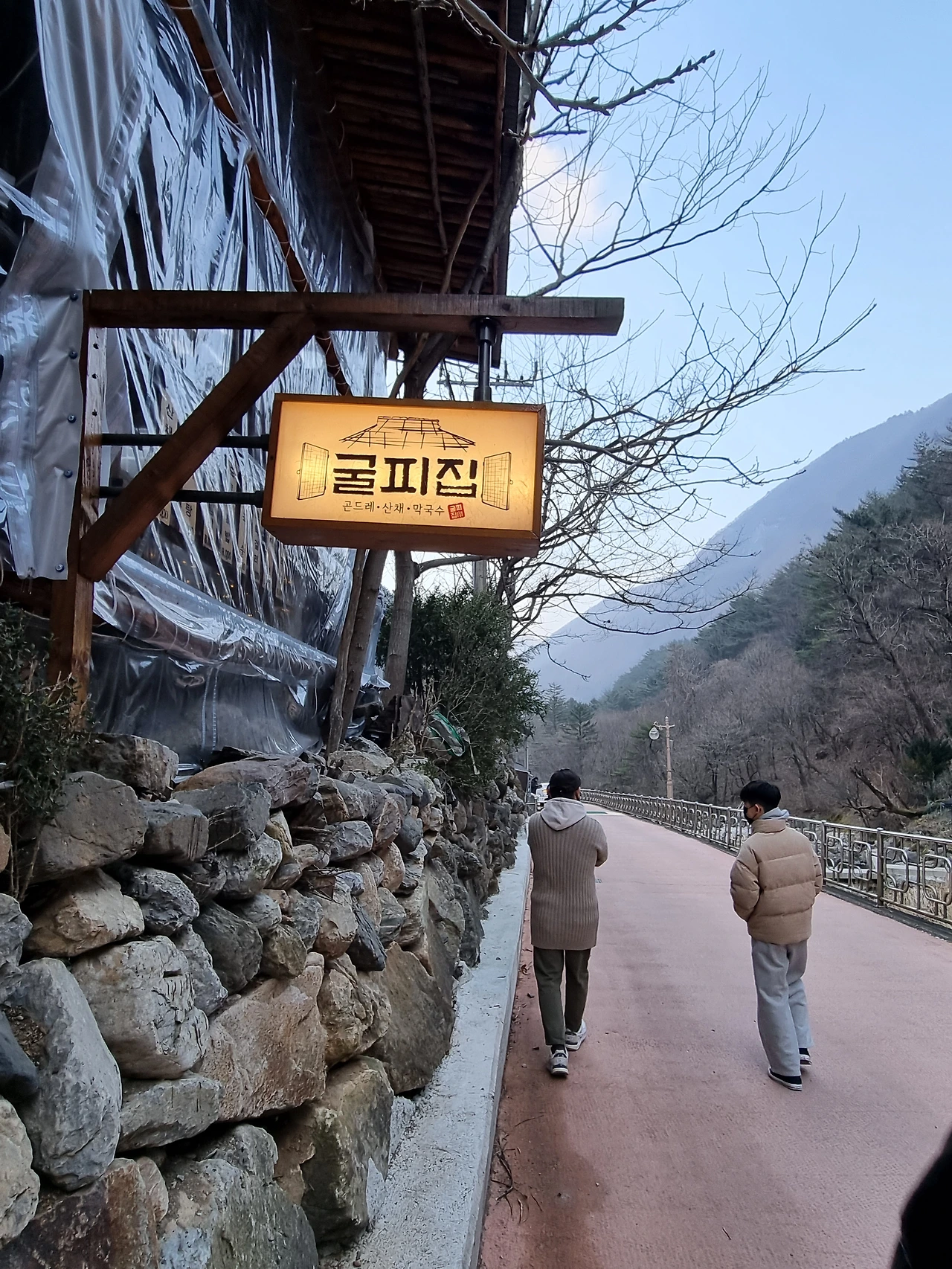 모노레일에 내려서 바로 앞에 있는 식당으로 들어간다. 배 고플 시간도 되었지만 우리에겐 당장 쉴 곳이 필요하다. 바닥과 돌 지형을 그대로 살리고 통나무로 뼈대만 만들어 비닐을 덮은 식당인데 간판과 전등이 아주 힙하다. 바삭한 감자전이 너무 맛있고 산채 비빔밥도 일품이다. 갈비탕이 조금 짜긴 하지만 이 날씨에 따뜻한 국물은 꼭 필요했고.