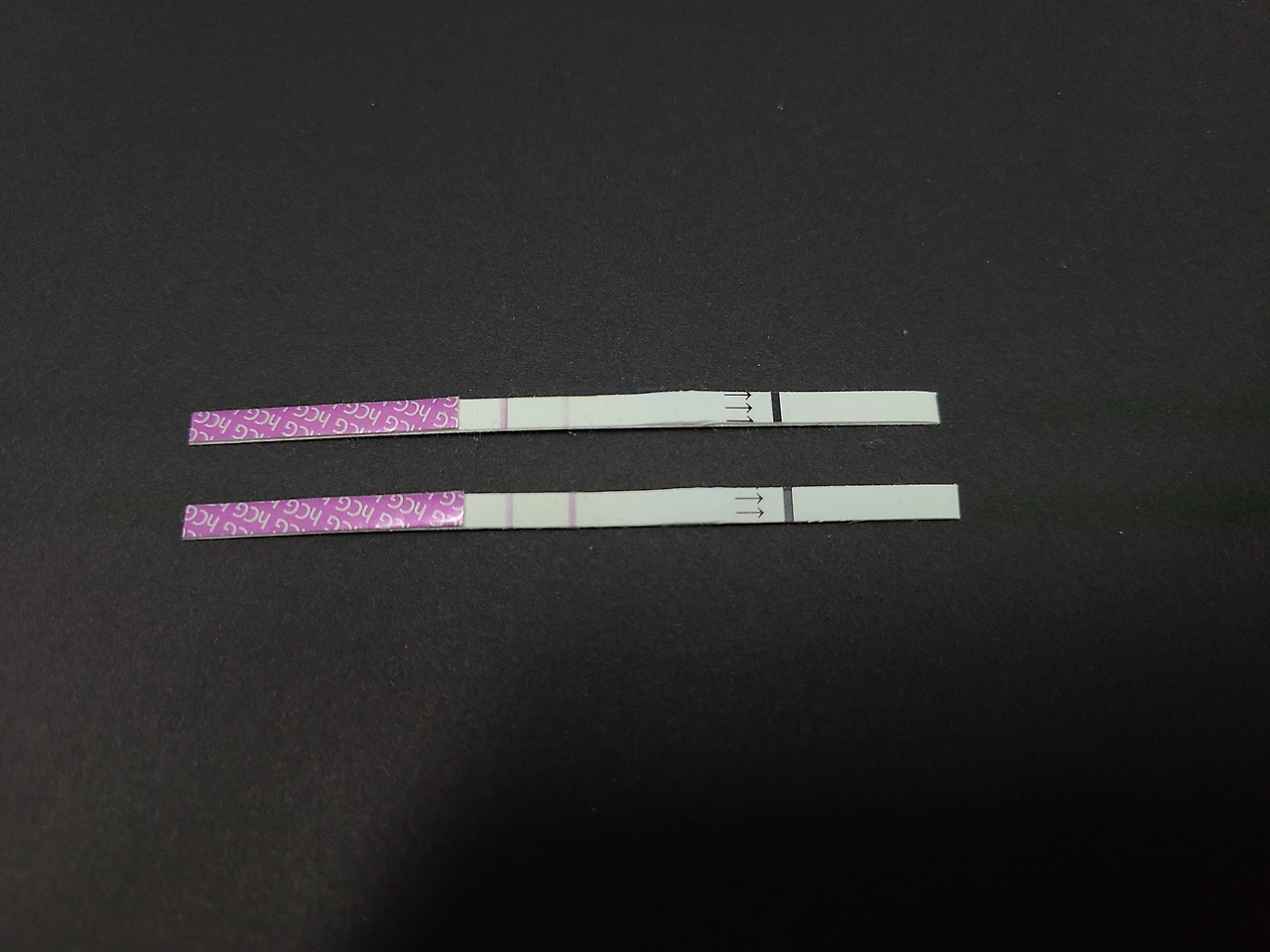 2줄이면 임신인데. 설마? 설마! 정말? 정말! 설명서에서 안내하는 5분은커녕 2분도 채 되지 않아 흐릿한 두 줄이 드러났어.