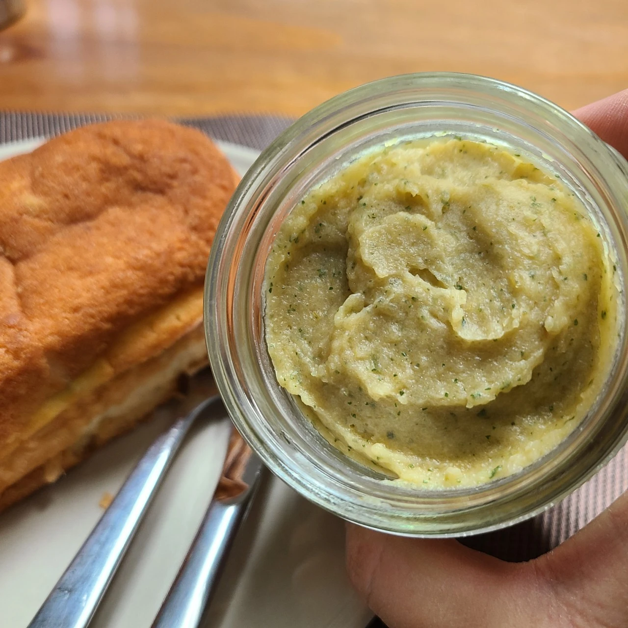 주말 아침은 간단히 빵과 커피로 해결할 때가 많다. 베이글, 치아바타, 식빵, 바게트 어떤 종류의 빵이어도 좋았다. 늘 함께 곁들이던 딸기잼과 크림치즈 대신 작가님이 보내주신 작은 병을 꺼냈다. 넉넉히 올린 마늘 버터를 펴 발라주니 내가 앉은 곳이 파리 샹젤리제 거리 같았다가, 다시 지리산 기슭 시원한 숲길 같았다가 했다.