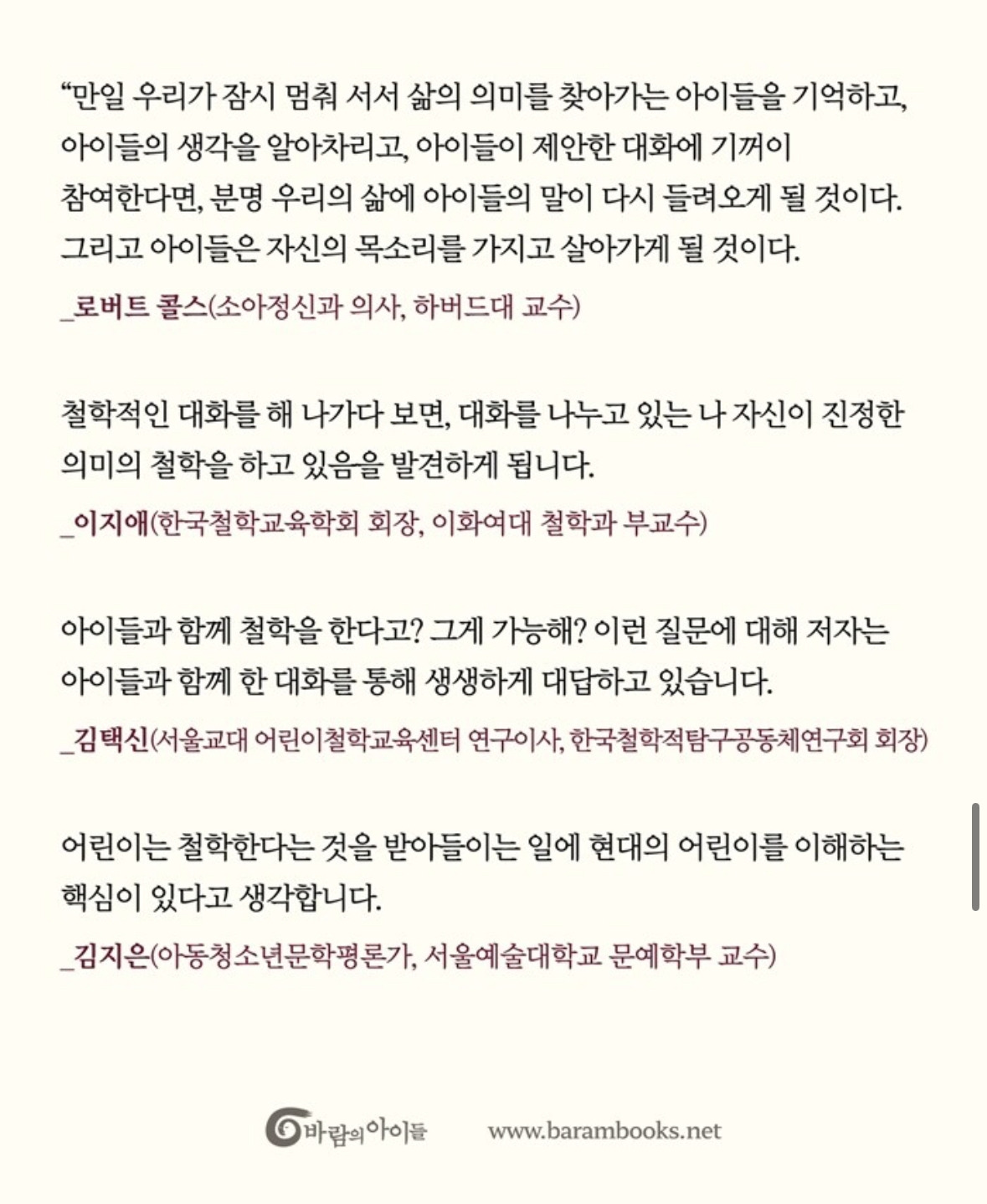 Children’s and youth literature critic Kim Ji-eun, who is also a philosophy major, recommended the book, saying, “I believe that accepting the fact that children do philosophy is key to understanding children today.” This is an essential book for all readers who wish to truly understand children.