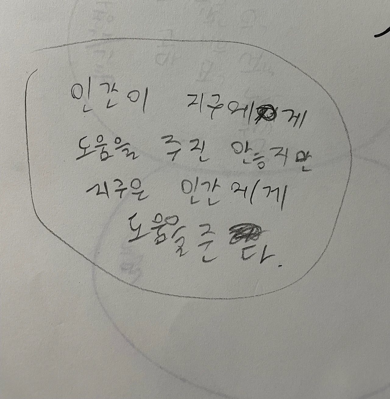 - 사람들의 어떤 면이 지구에 도움이 되지 않는 걸지 생각해봅시다.