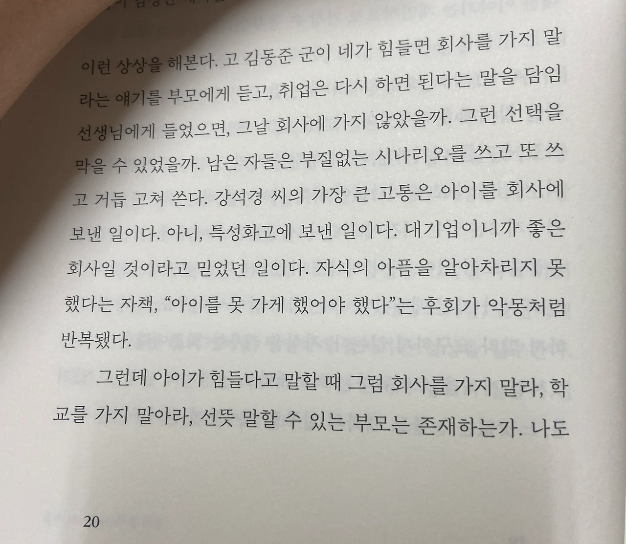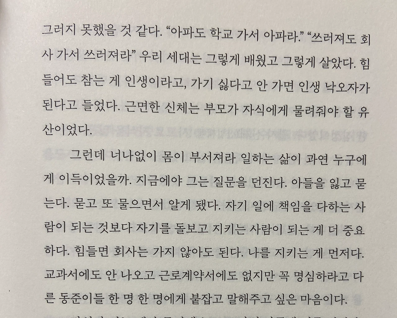 아이들이 걱정을 하지 않게 도와주는게, 걱정을 이겨내라고 말하는 것이 좋은걸까? <알지 못하는 아이의 죽음, 은유작가>”그런데 아이가 힘들다고 말할 때 학교나 회사에 가지 말라고 하는 부모가 있는가, 힘들어도 참는게 인생이라고, 안 가면 낙오자가 된다고 말해주었는데, 자기 이름에 책임을 다하는 것보다 나를 돌보고 지키는 사람이 되는 것이 중요하지 않은가. 별거 아니야. 라고 말해준다고, 이겨내라고 말해주는 것만이 부모의 일인가?