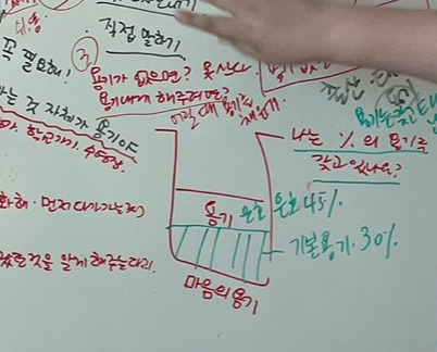 - 그러면 대부분의 사람은 30%의 용기를 가지고 있다고 해보고, 여러분은 '지금' 어느 정도의 용기를 가지고 살아가고 있나요? (연필로 표시해보고) '미래'에 어느 정도의 용기를 갖고 싶은지(색깔펜으로) 표시해봅시다.