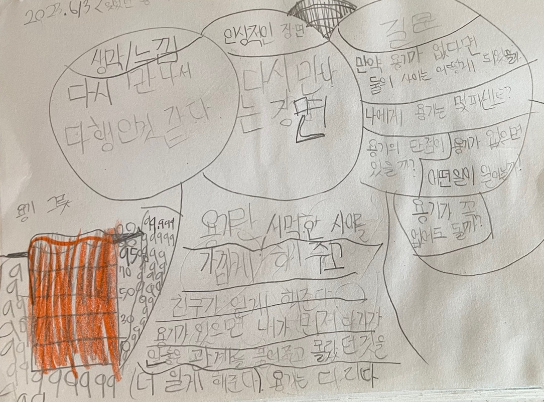 오늘은 '잊었던 용기'로 용기에 대한 더 깊은 이야기를 나누었다. 아이들이 1년 만에 얼마나 생각이 깊어졌는지 성장이 눈에 보여서 개인적으로 참 의미있는 시간이었다. (철학을 꾸준히 하면, 얼마나 아이들의 질문이 깊어지고, 생각이 확장될 수 있는지 확인한 시간이라서..조금 눈물이 났다.)