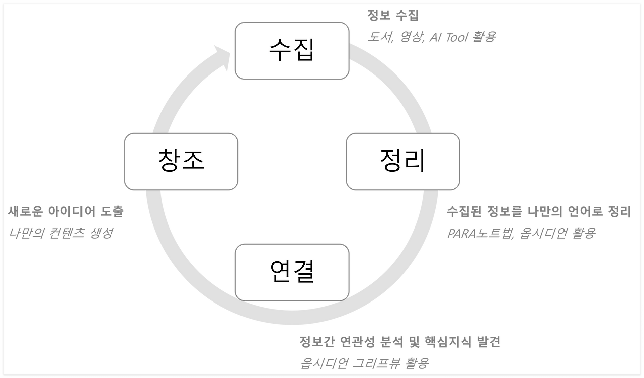 개인이 다양한 정보와 경험을 수집, 정리, 연결하여 자신의 맥락 안에서 새로운 지식을 창출하고 이를 효율적으로 활용하는 과정입니다.