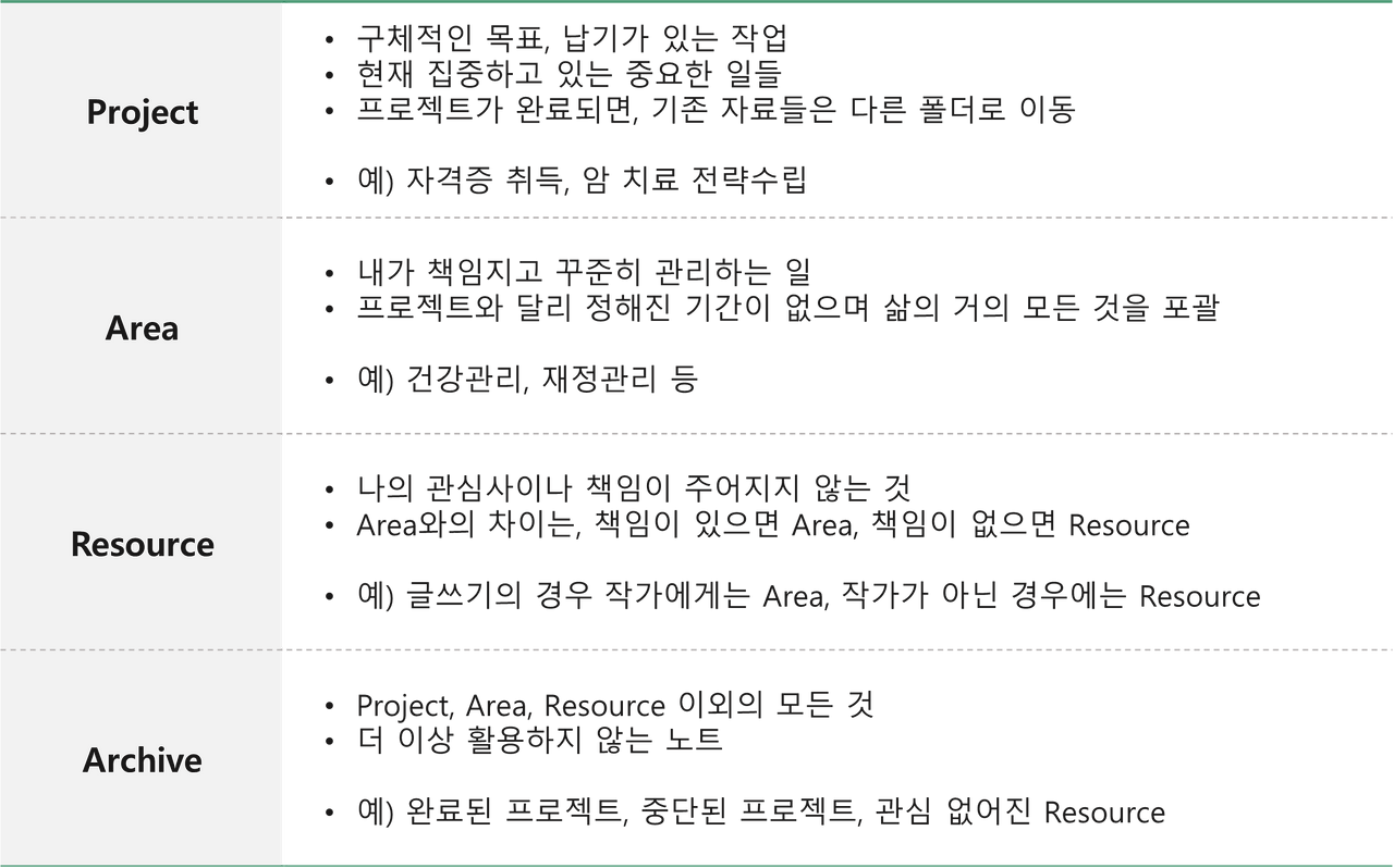 PARA 노트법은 모든 자료를 Project, Area, Resource, Archive 이 4가지 폴더로 나누어 정리하는 것으로, 단순히 노트를 정리하는 것을 넘어 "행동"을 중심으로 노트를 능동적으로 활용하게 합니다.