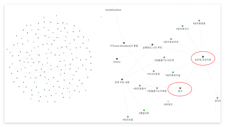 옵시디언의 '그래프뷰'에서 여러 선이 모이는 지점(노드)을 확인합니다. '보조제', '음식'으로 선들이 집중되는 것을 보고, 해당 정보를 나에게 맞게 보완합니다. 정보를 보완하고 연결된 결과를 확인하는 과정을 반복하며 나에게 맞는 실행방안을 정리해 갑니다.