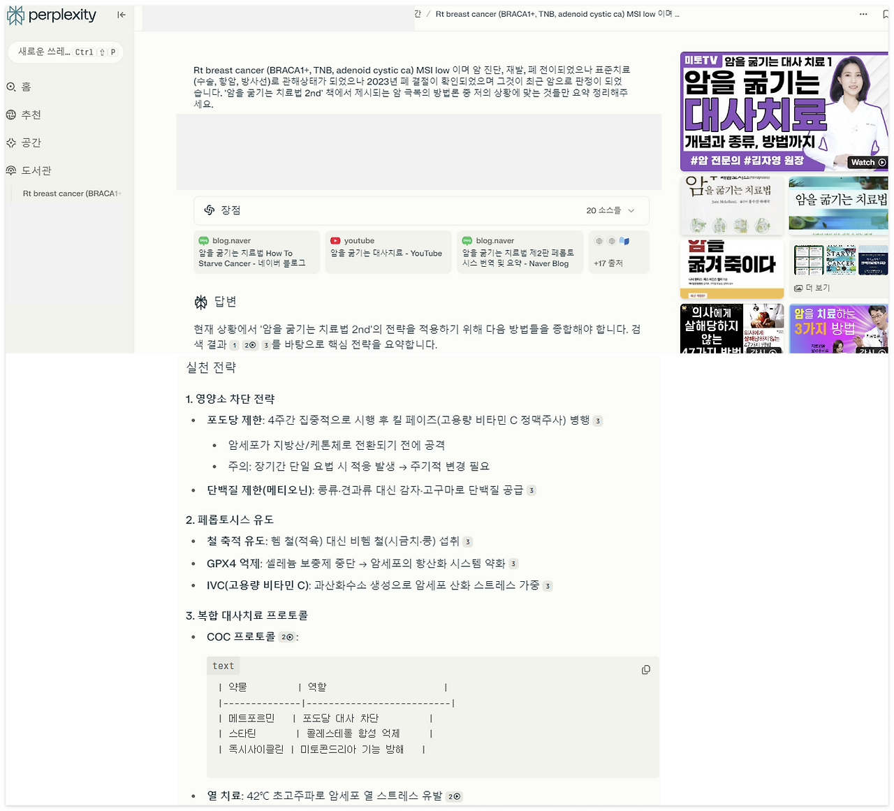 그런데, 옵시디언(Obsidian)과 인공지능 서비스가 만나 새로운 세계가 열렸습니다. 여러 개의 동영상을 Notebook LM으로 요약하고 퍼플렉시티(Perplexcity), GPT로 정보를 검색합니다. 그 정보에 나의 생각을 더해 옵시디언에 PARA 노트법으로 정리합니다. 옵시디언은 나의 관심사들이 어떻게 연결되는지를 네트워크 형태의 그래프 뷰로 보여줍니다. 이렇게 수집, 정리한 정보를 기반으로 나만의 콘텐츠를 만들어냅니다. 암을 극복하기 위한 전략 역시 이러한 과정으로 만들어졌습니다. 그 과정을 정리한 자료는 Felo AI, GAMMA를 활용하여 만듭니다. 물론, 생성형 AI 서비스가 제공해 주는 결과물을 그대로 사용하지는 않습니다. 자료의 목적에 맞는 시나리오와 콘텐츠 구성은 직접 하지만, AI 서비스를 통해 아이디어를 얻고 작업을 수월하게 하는 중입니다. 직원 한두 명을 두고 일하는 정도의 효과는 있습니다.