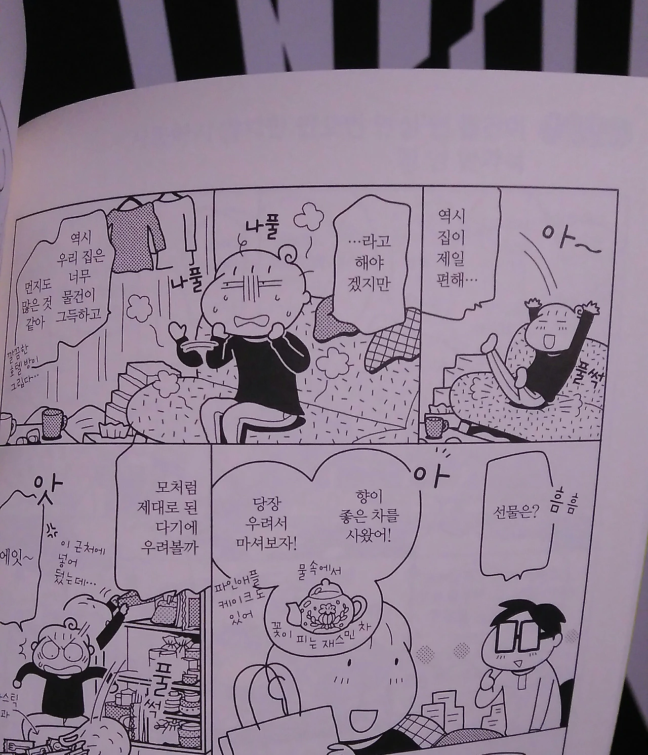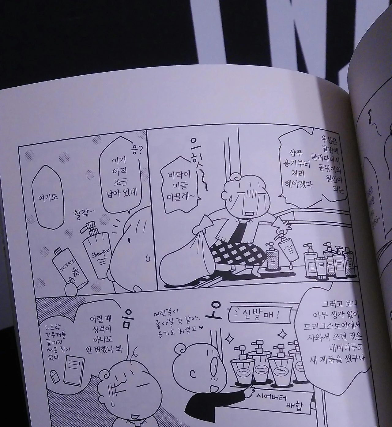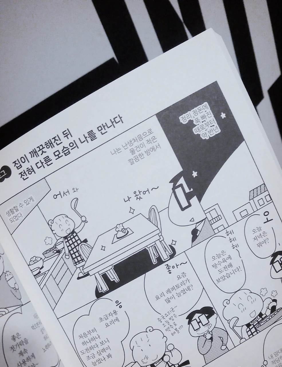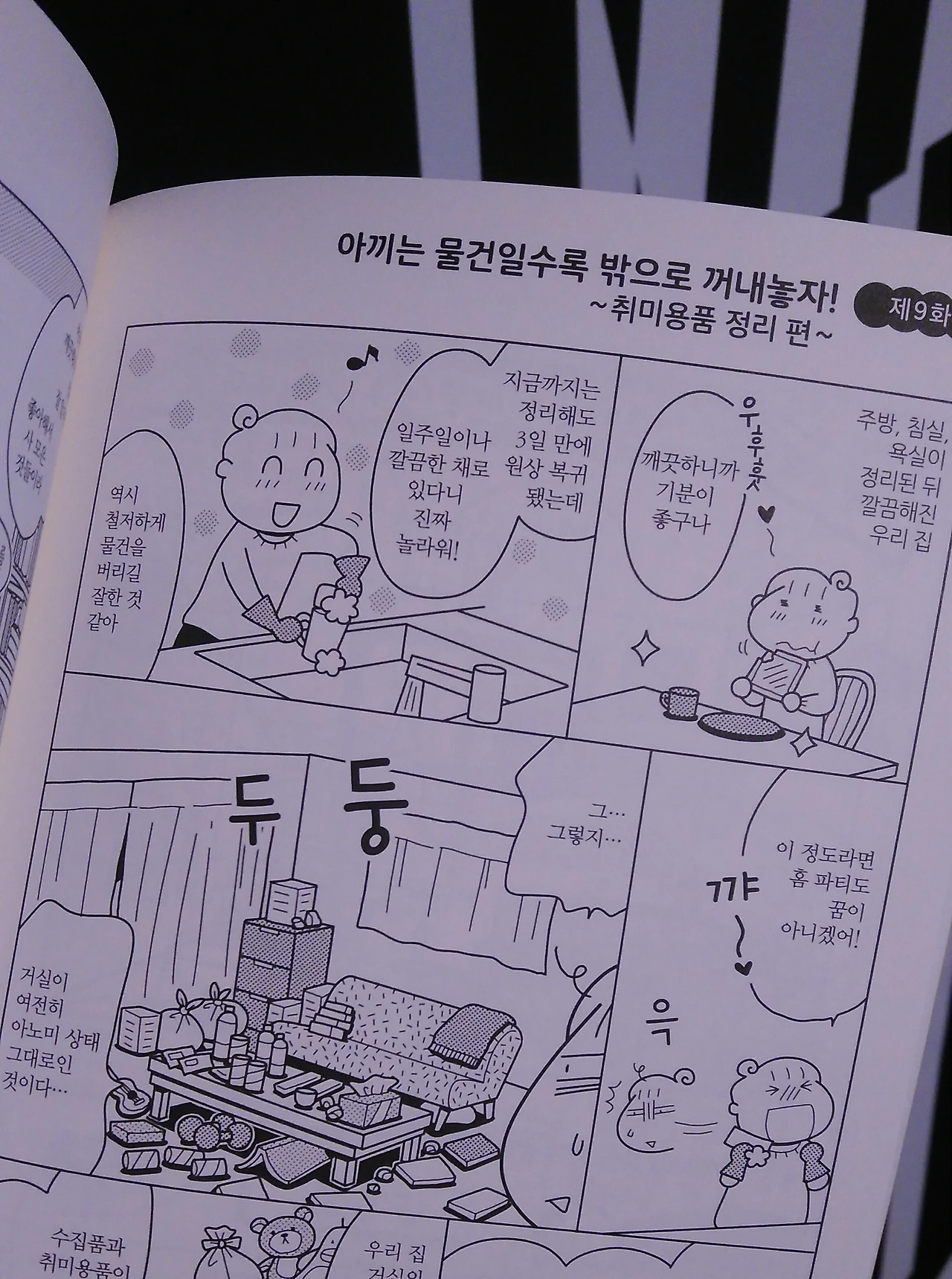 책의 매력은 크게 3가지다. 우선, 정리하기 전 상태가 상상이상으로 더러워서 재미있다. 단순히 더럽기에만 그쳤다면 보는 사람도 스트레스 받았을 거다. 그런데 정리를 시작한다. 확 다 버리고 깔끔해진 모습을 보여준다. 이게 시원시원하다. 그리고 마지막으로 그림이 귀엽다. 귀여운 그림체로 표현하니 지저분한 모습도 정리하는 모습도 마냥 이쁘다.