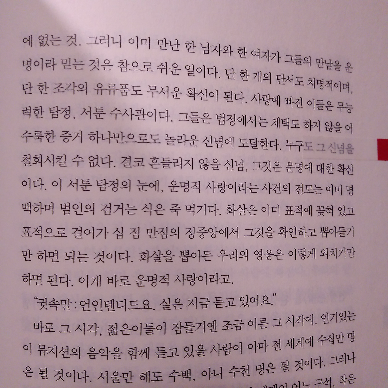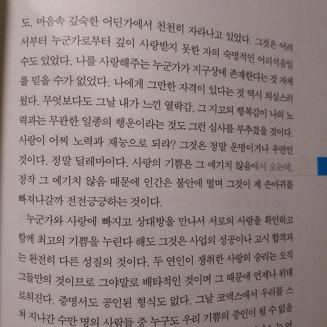 사랑이 어찌 노력과 재능으로 되랴? 그것은 정말 운명이거나 우연인 것이다. 정말 딜레마이다. 사랑의 기쁨은 그 예기치 않음에서 오는데, 정작 그 예기치 않음 때문에 인간은 불안에 떨며 그것이 제 손아귀를 빠져나갈까 전전긍긍하는 것이다.