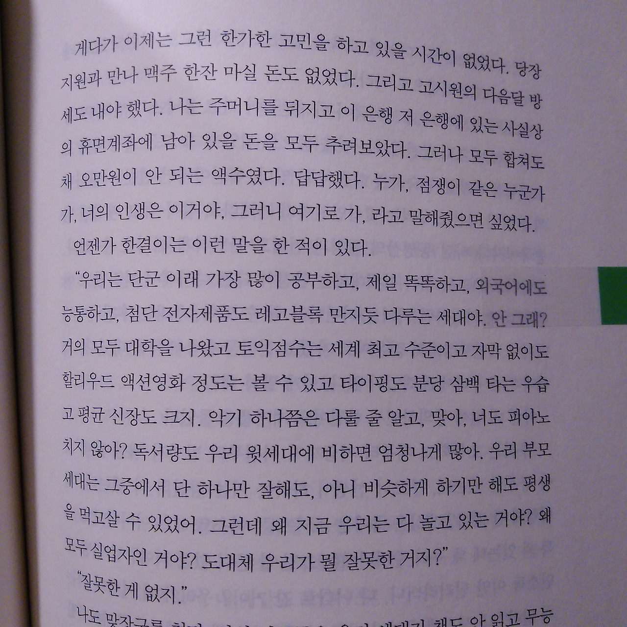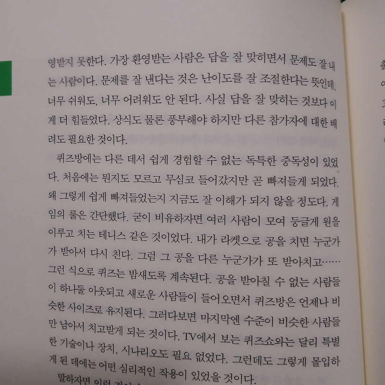 전화는 끊어졌다. 나는 머리를 감싸쥐고 침대 위에 걸터앉았다. 조금 전의 사건을 통해서 적어도 한 가지는 배웠다고 생각했다. 어떤 질문은 충분히 생각할 시간이 주어지지 않을 수도 있다. 달리 말하자면, 충분히 생각할 시간을 주지 않는 퀴즈도 있다. 그러나 그로부터 얼마 지나지 않아 나는 인생의 거의 모든 질문이 그렇다는 것을 알게 되었다.