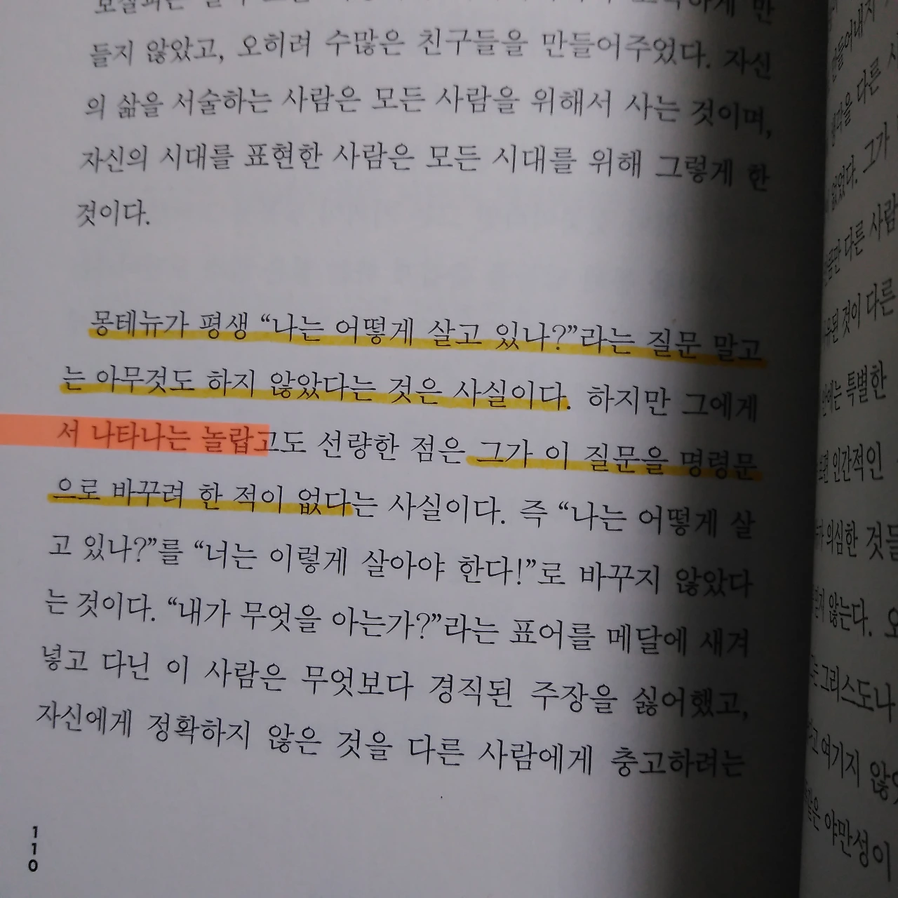 몽테뉴가 평생 "나는 어떻게 살고 있나?"라는 질문 말고는 아무것도 하지 않았다는 것은 사실이다. 하지만 그에게서 나타나는 놀랍고도 선량한 점은 그가 이 질문을 명령문으로 바꾸려 한 적이 없다는 사실이다.