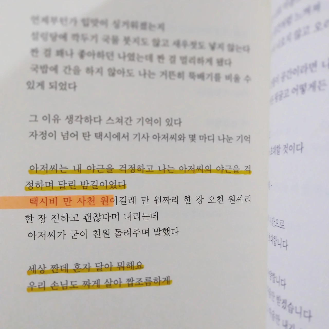 아저씨는 내 야근을 걱정하고 나는 아저씨의 야근을 걱정하며 달린 밤길이었다. 택시비 만 사천 원이길래 만 원짜리 한 장 오천 원짜리 한 장 전하고 괜찮다며 내리는데 아저씨가 굳이 천원 돌려주며 말했다