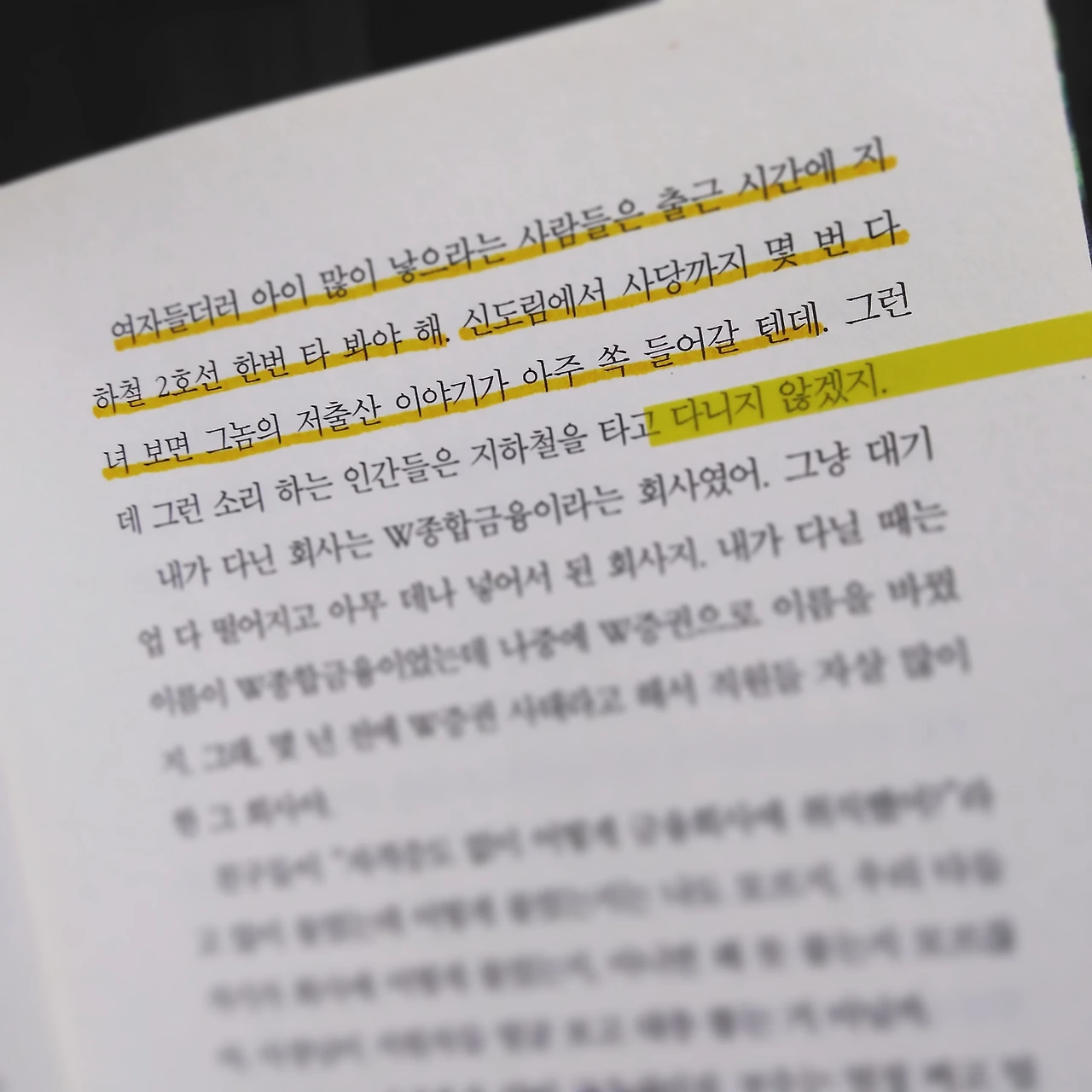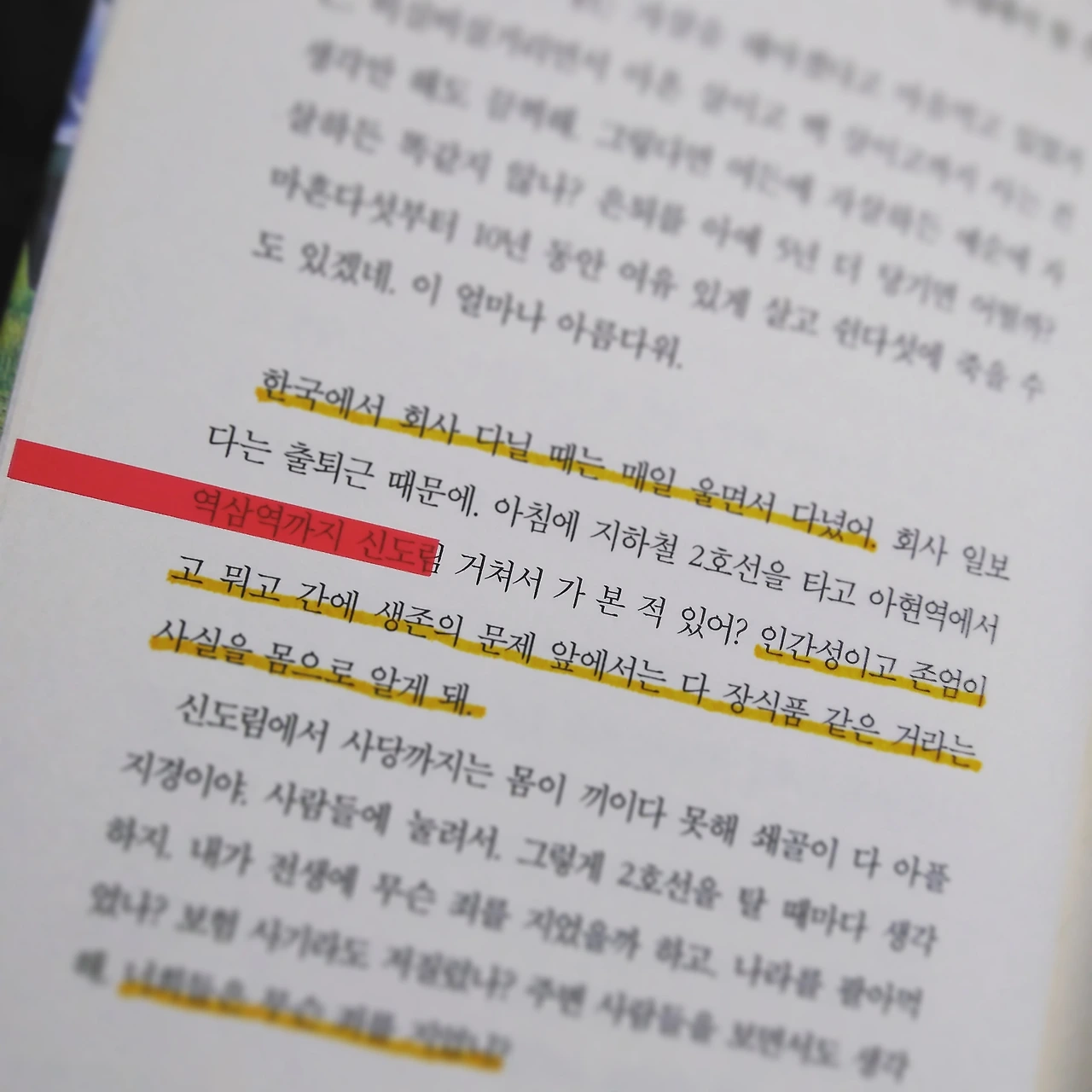 한국에서 회사 다닐 때는 매일 울면서 다녔어. 회사 일보다는 출퇴근 때문에. 아침에 지하철 2호선을 타고 아현역에서 역삼역까지 신도림 거쳐서 가 본 적 있어? 인간성이고 존엄이고 뭐고 간에 생존의 문제 앞에서는 다 장식품 같은 거라는 사실을 몸으로 알게 돼.