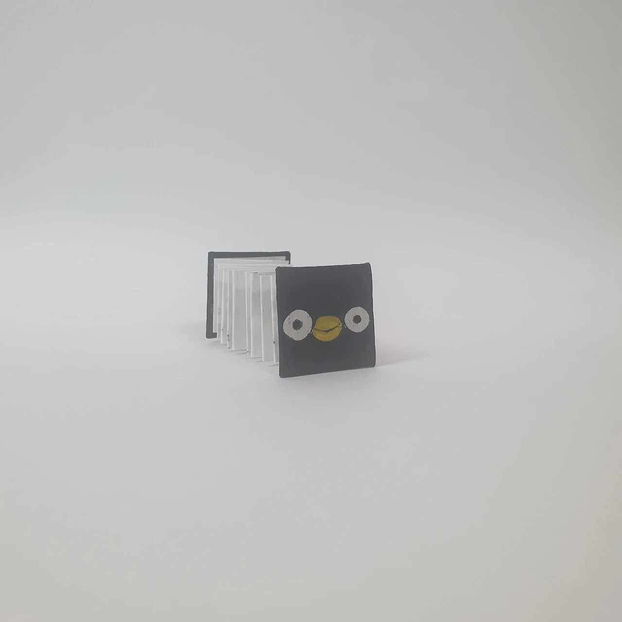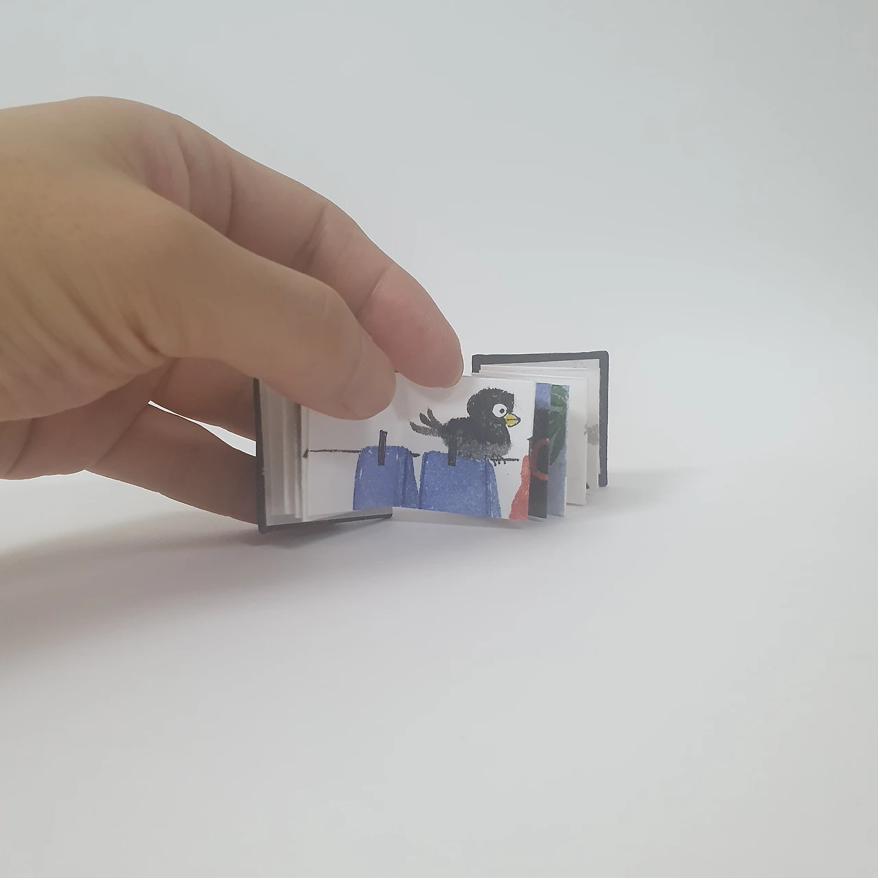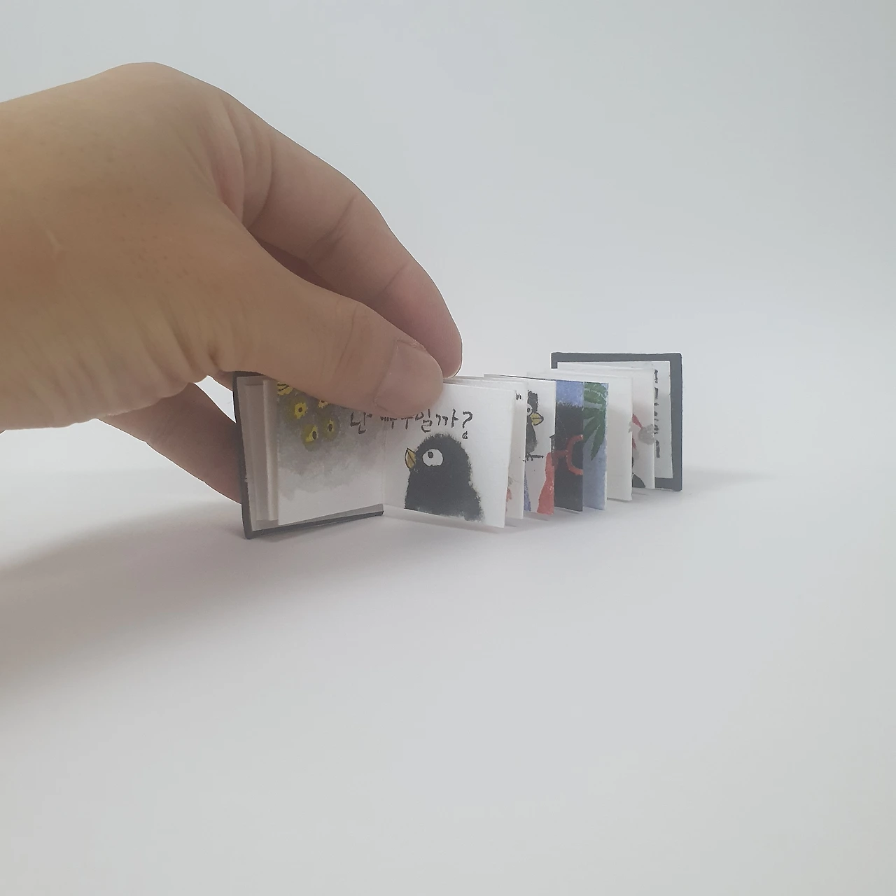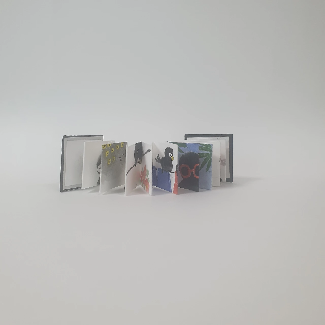 새장을 탈출한 검정 참새의 친구찾기 이야기이며 먹, 한국화물감, 전각, 한지를 이용한 아코디언 미니북입니다. 인쇄하지 않았고, 하나하나 직접 그려서 만들었습니다.