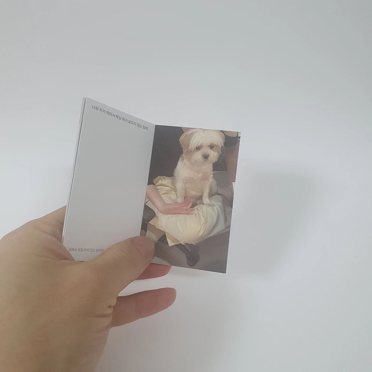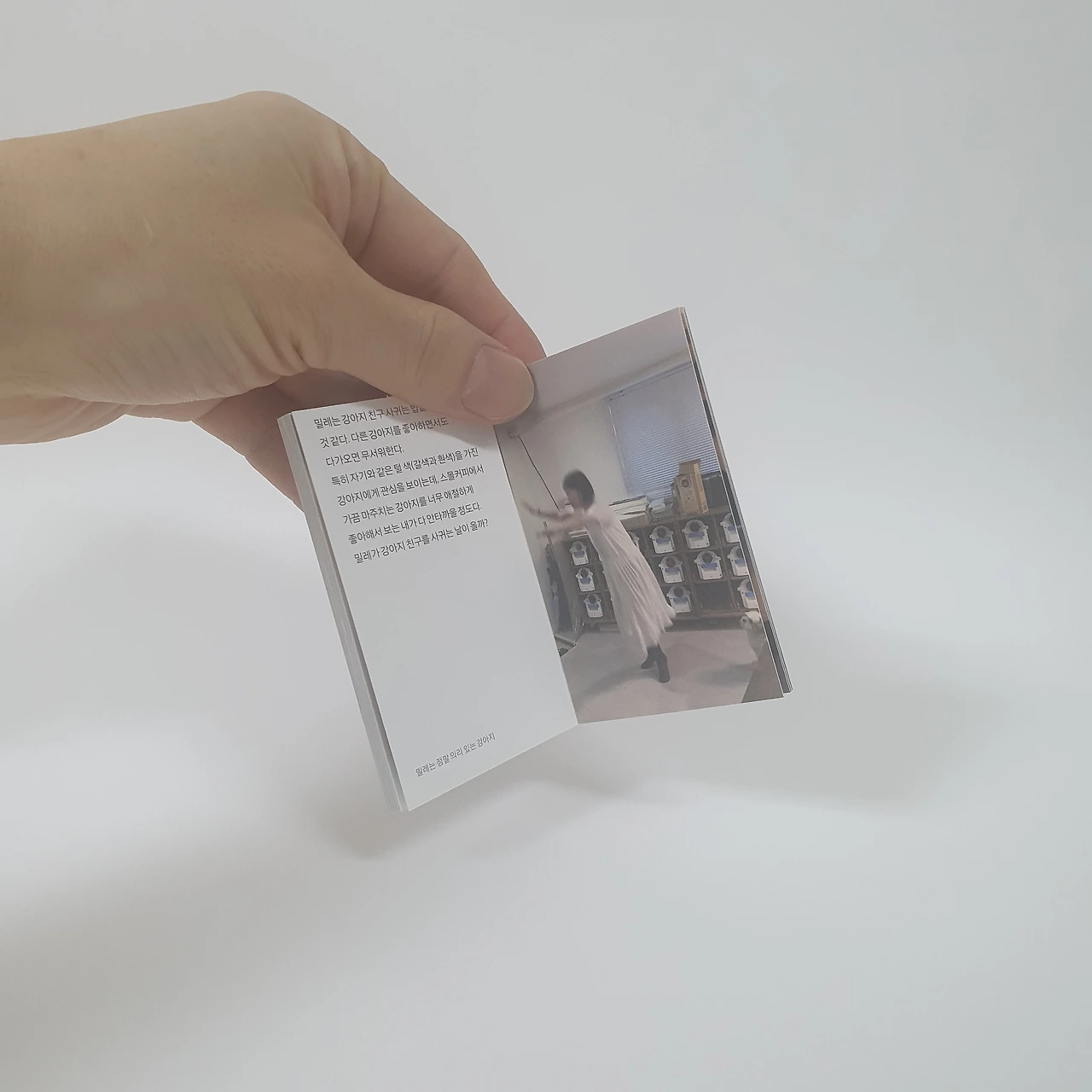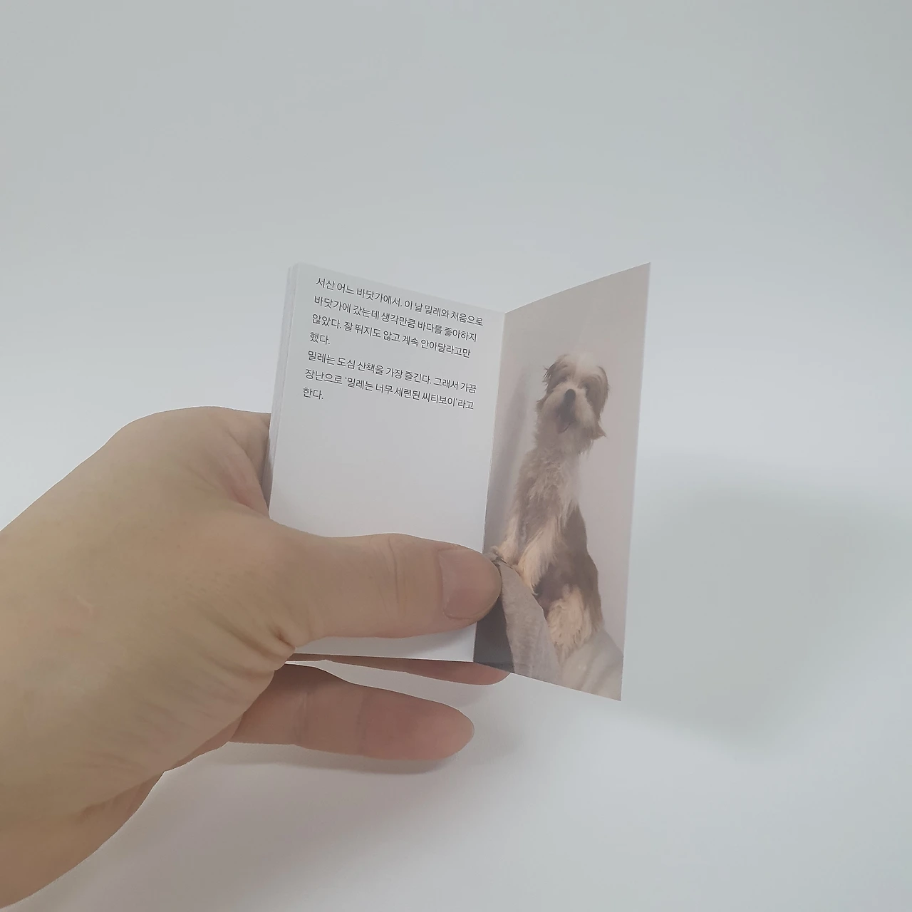 겁이 많지만 용맹한 강아지 밀레의 사진 16장을 담았습니다. 뚱한 표정부터 귀여운 표정, 바람을 이겨내는 표정까지 볼수록 정이 가는 밀레의 모습을 보다 보면 책 제목을 자연스럽게 납득하게 됩니다.