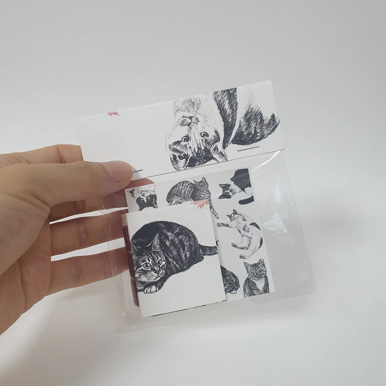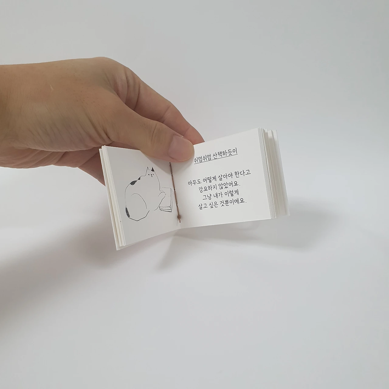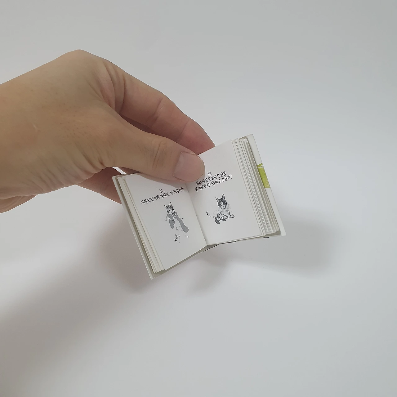 2024년을 위해 판매했던 달력 재고분을 표지로 리사이클해 하나하나 손으로 꿰맨 <냥냥이 그림책>입니다. 80개의 손그림과 100가지 문장으로 길에서 만난 고양이들의 이야기를 담았어요. 모델이 된 고양이는 구조되어 삶을 찾았거나 동물권행동kara에서 가족을 기다리고 있는 고양이들입니다. 4.5 × 5cm(책등 약 1cm)의 작은 사이즈지만 고양이의 만남, 구조, 반려, 이별까지 고양이의 일대기를 만나볼 수 있답니다.