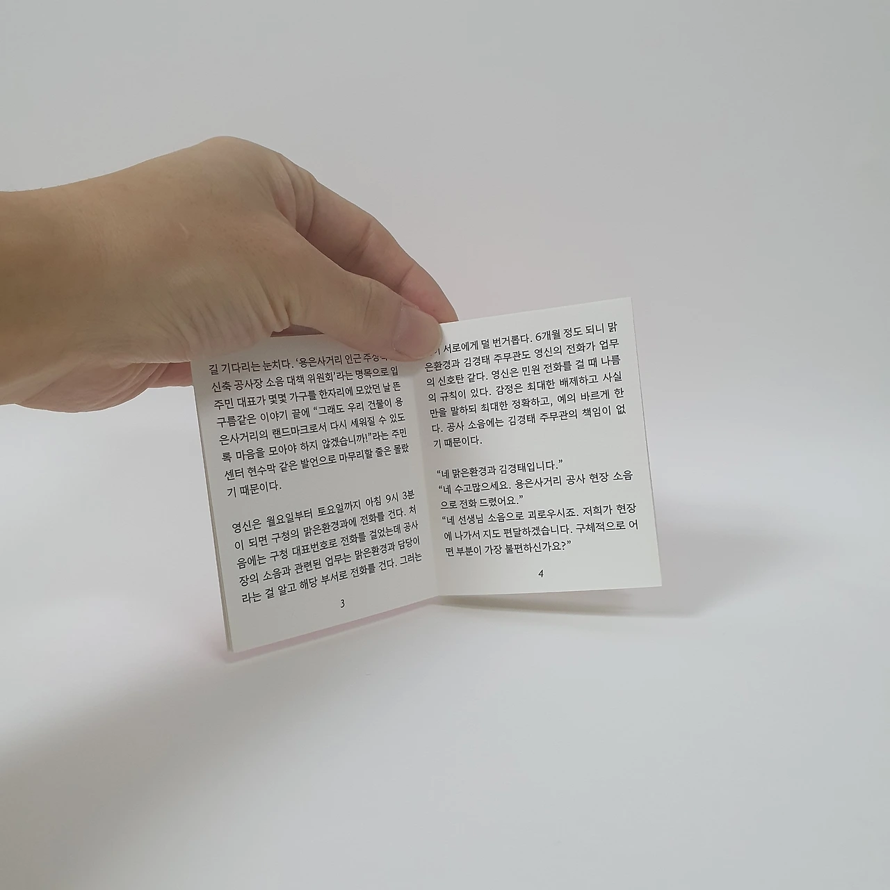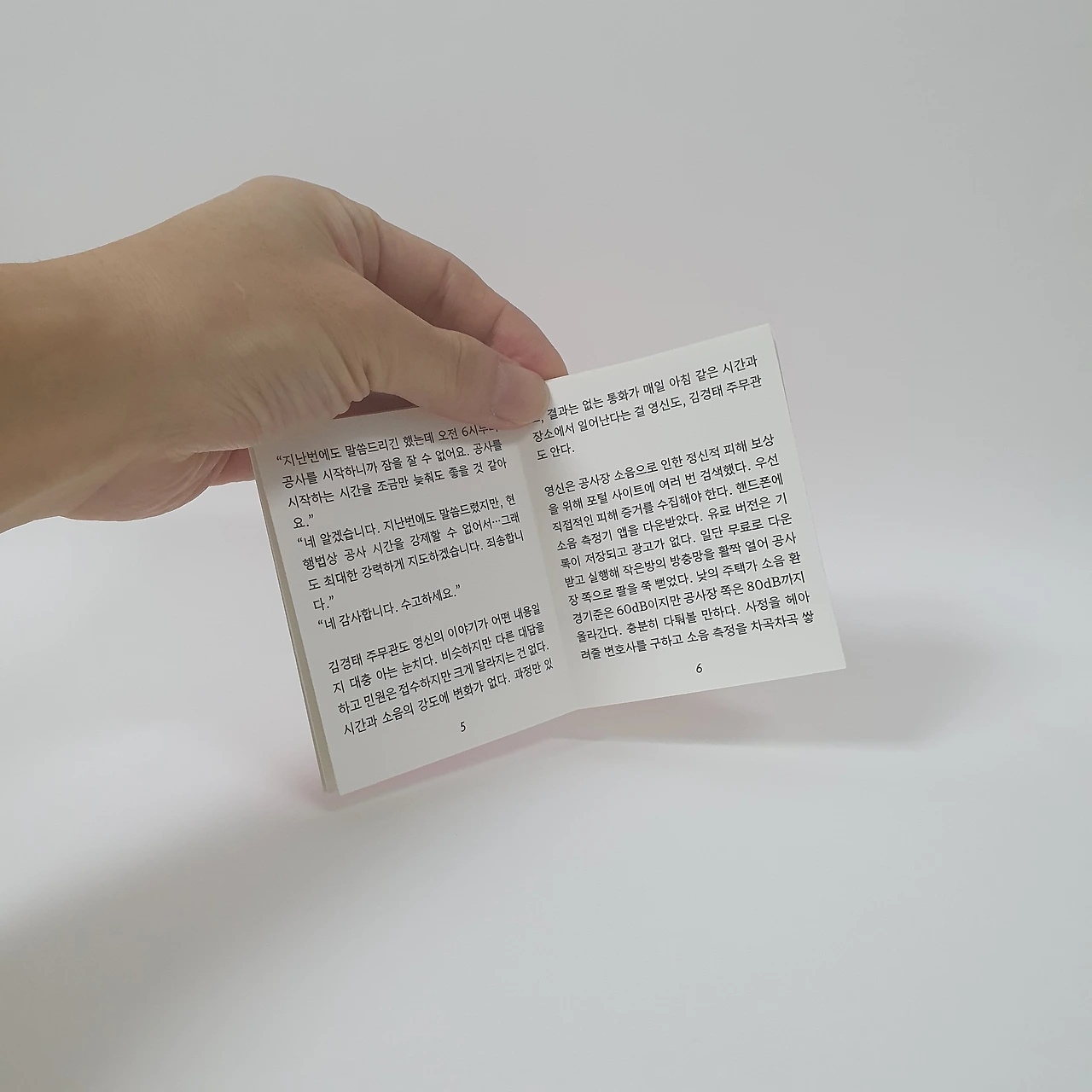 주머니에 쏙 담아 생각날 때마다 꺼내 읽을 수 있는 크기와 분량의 엽편입니다. 도시 개발로 일상이 조금씩 무너지는 주인공 영신의 이야기가 담겨있어요. 영신이 공사 소음에서 벗어나기 위해 여러 시도를 하지만 뜻대로 되지 않으며 겪는 이야기입니다.