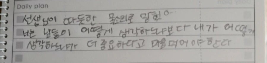 선생님이 따뜻한 목소리로 말했어. 너는 남들이 어떻게 생각하느냐보다 내가 어떻게 생각하느냐가 더 중요하다고 마음먹어야 한다.