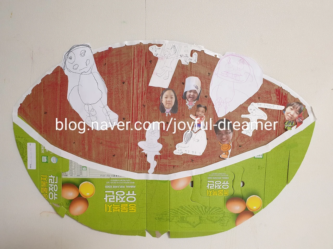 사용된 물품: 종이박스, 크레파스, 유치원에서 배부한 스티커 자료 남은 부분, A4용지