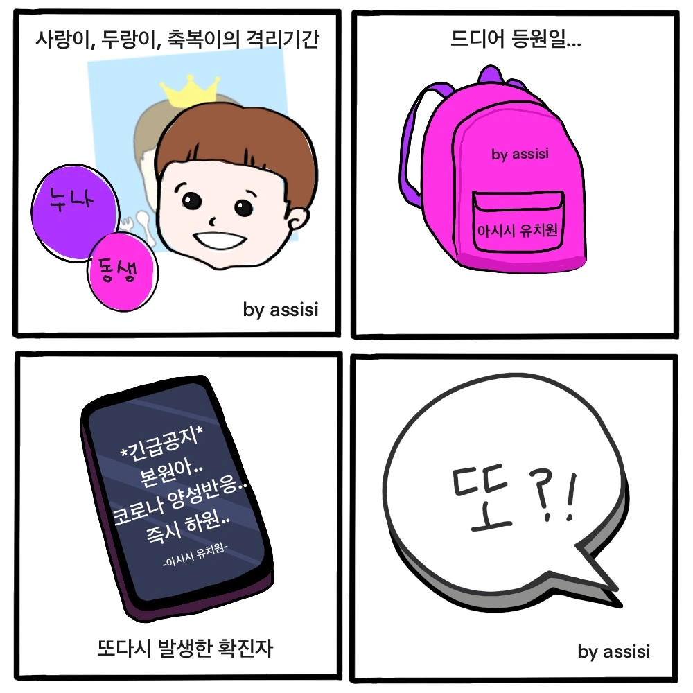 열흘이 넘는 기간 동안, 엄마는 정신없이 바쁘고, 세 아이는 너무 즐거운 시간을 보냈다. 드디어 유치원 등원하는 날! 우와.. 드디어 두 아이를 보낼 수 있는 거야?나의 발걸음이 새처럼 가볍다. 오늘따라 남편이 데려다준다고 하니, 아침 시간마저 선물 받는 기분이었다. 갑자기 핸드폰 알림음이 울린다. 느낌이 쎄하다. 단체 연락이다. 확진자가 '또~' 발생했다. 남편에게 급히 연락해서 아이는 발걸음을 돌렸고, 남편은 허무한 웃음과 함께 출근지로 향했다. 비록, 아이의 긴 자가격리기간으로 전날 실시한 코로나 검사를 또 안 해도 되었지만, 아이는 연이은 자가격리덕(?)에 며칠을 더 쉬게 되었다.