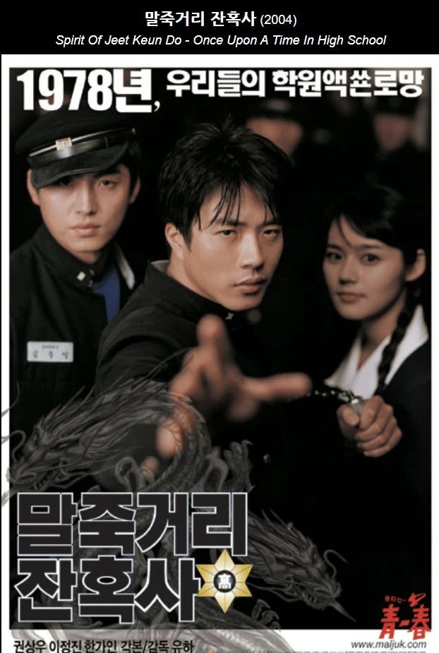 영화 <말죽거리 잔혹사>를 기억한다. 강남의 땅값이 오를 것을 예상한 어머니가 서둘러 이사를 하게 되며, 그녀의 아들이 강남 정문고로 전학을 오게 된다. 그 학교는, 선생님뿐만 아니라 학생들 사이에서도 그 폭력으로 인해 악명 높다. 요즘 시대로는 문제 되지 않을 일로, 교사는 학생을 개 패듯 패며 학생들 간의 폭력은 상상을 초월한다. 1978년을 배경으로 했다.