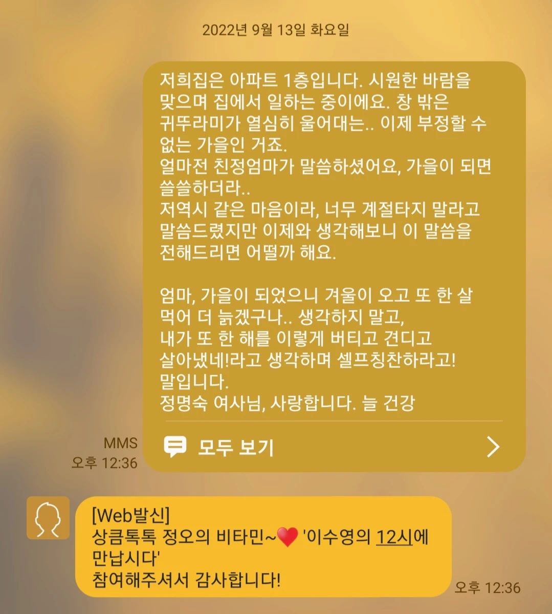 곧, 가족 단톡방에 자랑을 했다. 번개의 속도로 녹음한, 이수영 언니가 읽어준 내 사연은 "엄마 선물~"이라는 톡과 함께 음성메시지로 올렸다. 얼마 안 되어 "눈물난다."는 카톡 하나로 엄마는 내게 마음을 전하셨다. 별 거 아닌, 이 문자로 전한 마음이 전파를 타고 엄마의 마음에 위로와 사랑을 전해주어 감사하다.