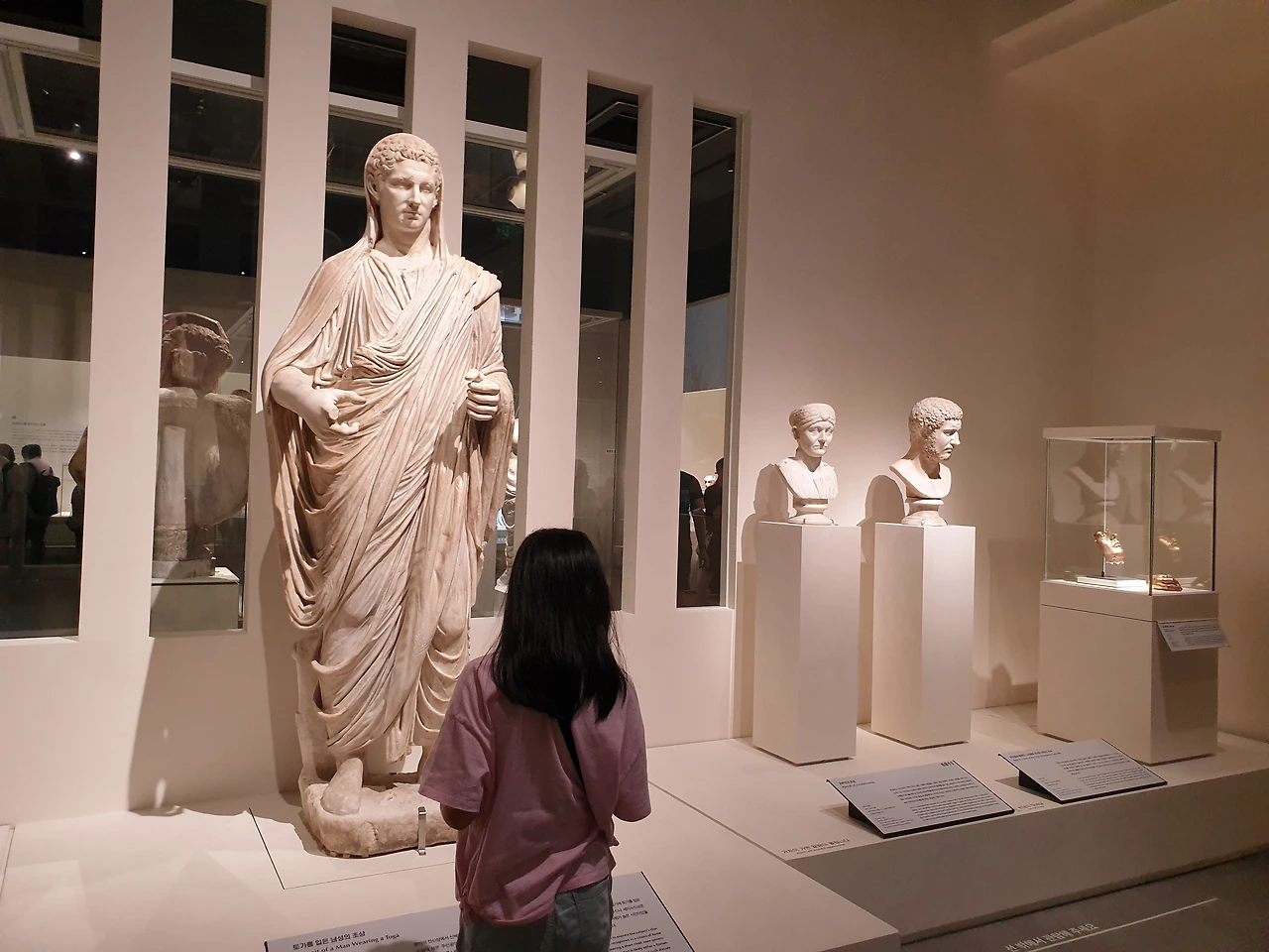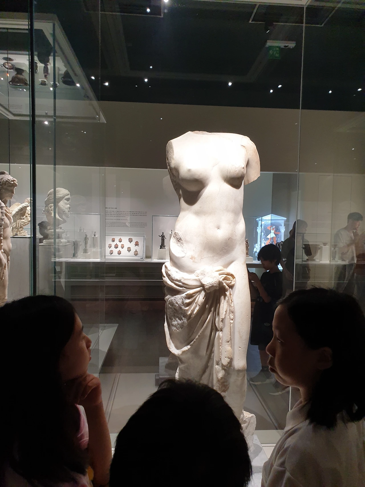 라고 단호하게 말하기 일쑤였다. 때론 먹을 걸 달라는 아이들의 말이 등골을 오싹하게할 정도로 공포스럽게 느껴지기도 했다. 점심을 먹고나면 아침에 먹고 못 치운 그릇, 조금전 생긴 점심 그릇이 히말라야 산처럼 수북해져있었다. 숨이 턱턱 막히는 집안일 중 한 가지인 설거지를 하는동안 아이들은 오후에 학원을 한 곳 가거나 대부분 집에서 하루를 보냈다. 특별한 일 없는 나날을 보낸거다. 방학인데 어디 나가지도 못하고 집에만 있는 아이들에게 늘 미안한 마음이 가득했다. 이런 내게 남편은 집에서 일해서 그렇다며 사무실에서 일한다 생각하라고, 너무 미안해하지 말라고 위로해 주었다. 이런 상황에서 겨우 시간을 내어 간 곳이 두 곳이다. 우리집 아이들의 버킷 리스트인 ‘워터파크’, 그리스로마전이 열린다는 ‘국립 중앙 박물관’에 다녀왔다. 둘다 하루를 꽉 채우며 시간을 보냈다. 어떻게 마련한 시간이고 어떻게 집 밖으로 나왔는데 시간을 허투로 쓰겠나? 아이들은 설렘가득 안고 새벽에 일어났고, 밤이 되자 아쉬움의 끝자락을 붙잡았다.