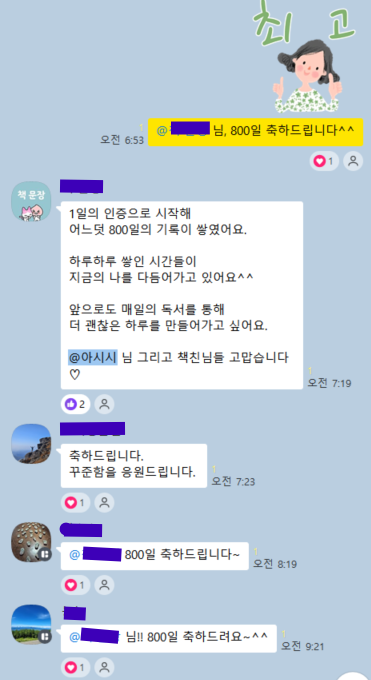 얼마 전, 독서 커뮤니티 <매일의 책갈피, 15분> ㅊ님이 독서 누적 성공일 800일을 채웠다.