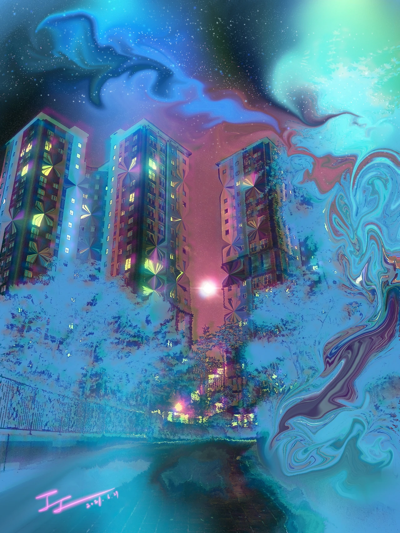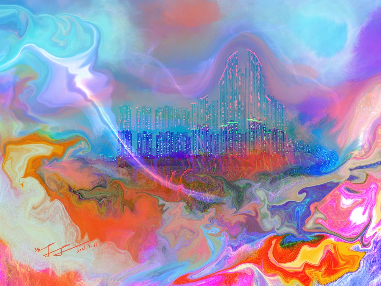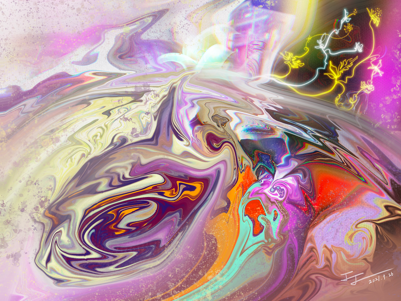 오늘, 아직 선명한 어제의 밤 산책을 손으로 기억하며 어제 흘려보낸 모든 감정들을 다시금 화면 안에 마음껏 흐르게 해 두었다. 오랜 시간 각고의 노력을 해 온 친구의 성공에 축배를 들던 지난 7월 26일의 순간도, 올해 들어 가장 큰 슬픔으로 남은, 유난히도 화창했던 6월 16일의 순간도 그날의 색채가 마음속에서 사라지기 전에 모두 기록해두었다. 추상 일기는 순간과도 같은 어느 하루를 가장 순간답게 담아내는 나의 기록 방식이다. 그 어떤 자세한 말도, 유려하게 표현한 글도, 추상으로 표현한 이 한 장의 그림보다 나를 그날의 감정 속으로 완전히 빠져들게 하는 것은 없다. 순간의 본질과 가장 닮은 모습으로, 그렇게 또 하루를 기록한다.
