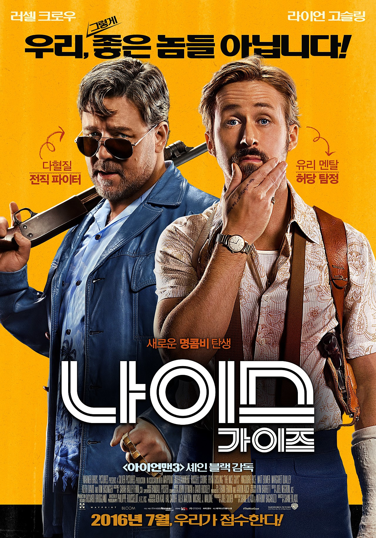 사실 이 영화를 연출한 "셰인 블랙" 감독은 각본가로 조금 더 유명하다. <리썰 웨폰>(Lethal Weapon, 1987) 시리즈를 통해 각본을 쓰기 시작하면서 제작자 "조엘 실버"를 만나 자신의 이름을 조금씩 알리기 시작했다. 감독으로 전향한 지는 채 10년이 되지 않았으며, "존 파브로" 감독의 뒤를 이어 <아이언 맨 3>(2013)를 연출하면서 디렉터로서의 자신의 능력을 인정받았다. 최소 2억 달러 이상의 제작비가 투입되었던 <아이언 맨 3>에 비하면 이 작품 <나이스 가이즈>는 그 1/4에 못 미치는 5천만 달러 정도의 소규모(?) 작품이다. 애초에 이 작품은 제작자 "조엘 실버"의 지휘 아래 총 3부작으로 제작될 계획이었다고 한다. 실제로 "조엘 실버"는 <리썰 웨폰>, <다이하드>, <매트리스> 등의 대단한 시리즈물들을 탄생시킨 장본인이었으니 북미 현지에서도 관심을 가질 수 밖에 없었던 작품이다. 결과적으로 3,500만 달러라는 총 제작비에도 못 미치는 흥행 성적 때문에 이 계획이 계속될 수 있을지에 대한 의견이 분분한 상태라고 하니, 어쩌면 이 작품은 여기에서 끝이 날지도 모르겠다.