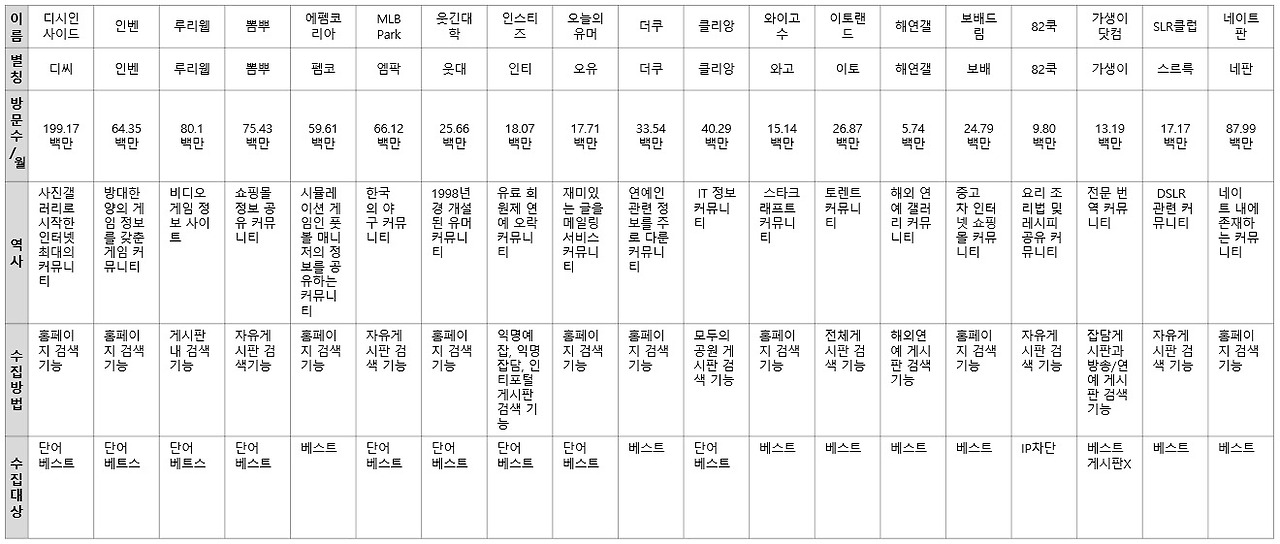 국내 온라인 커뮤니티 중 웹 트래픽을 기준(SimilarWeb, Alexa 데이터 활용)으로 상위 20개를 다음과 같이 선정했다.(일베가 포함되어 있었으나, 재활용 불가능한 쓰레기를 선정할 수는 없어서 과감히 쓰레기통으로 버렸다.)