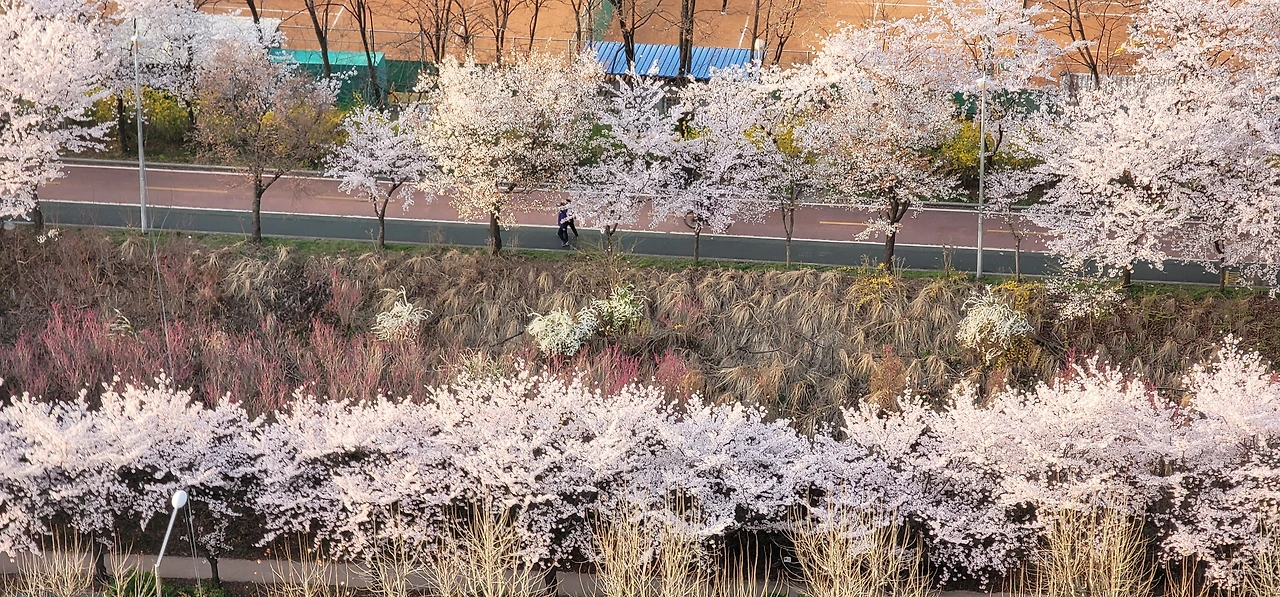거실에 들어오면 올림픽공원이 시원하게 펼쳐져 있고 주방창으로는 한강의 붉은 석양빛을 볼 수 있었던 곳, 지금의 아파트보다는 무려 10평에 가까운 공간이 넓었던 아파트에 살았었다. 현관문을 열고 아이들 방을 지나쳐 거실로 걸어가면 거침없이 보이는 그 뷰에 감탄하며 2년을 행복하게 거주했다. 그것도 외출하는 것도 조심스럽던 시기, 우울하기 그지없는 코로나 시국에 머물렀다. 처음 맞이하는 봄날에 내려다본 세상은 황홀했다. 겨우내 앙상했던 올림픽공원의 나무들이 푸르른 옷을 입고 성내천에서 한강으로 가는 송파둘레길의 벚꽃들이 한겨울 눈의 왕국처럼 피어 있었다.