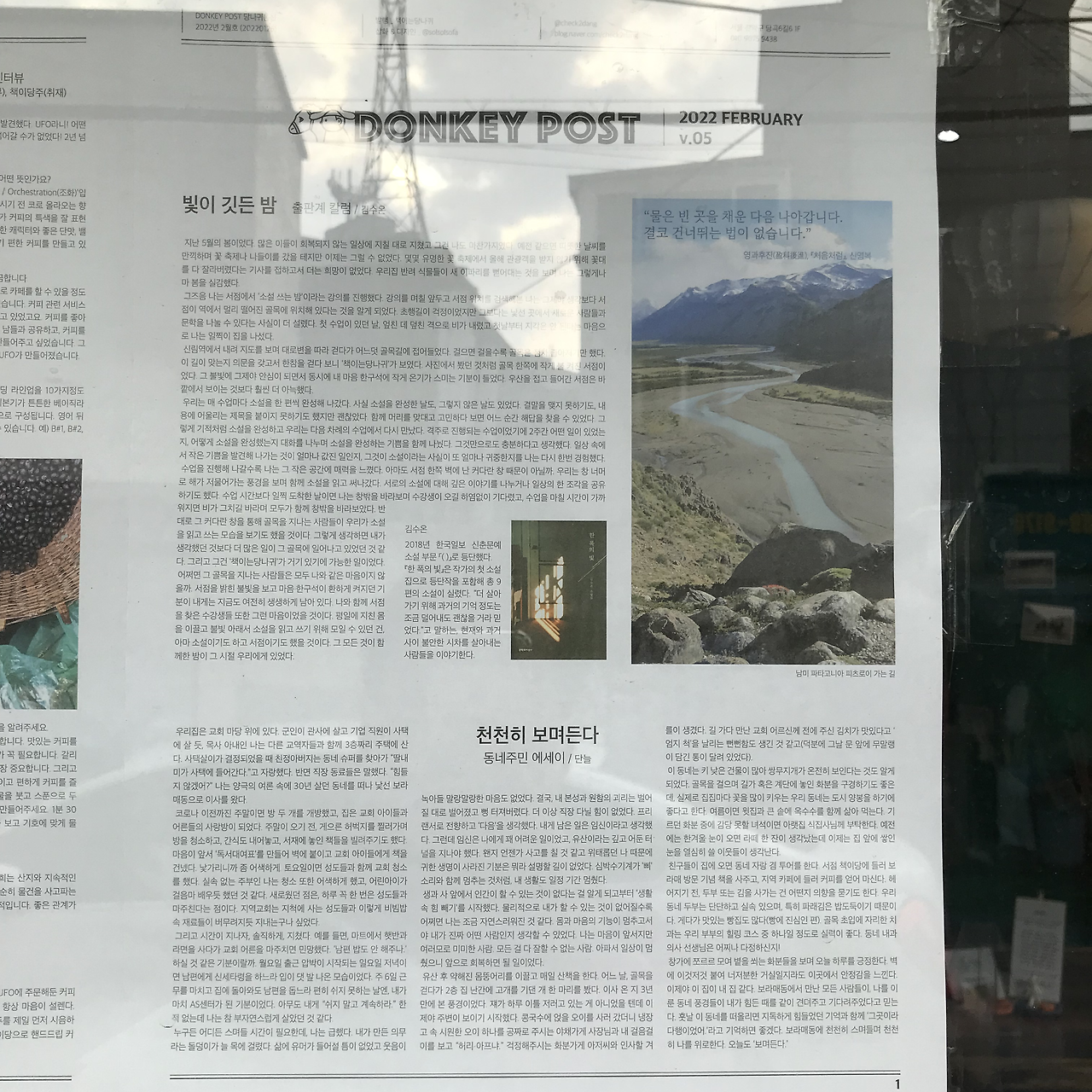사려 깊은 사장님이 "잘 오셨어요" 하고 환대해주는 서점이다. [당나귀 통신]을 발행하며 지역 주민, 서점 손님들과 소통하는 사장님 내외를 보며, 지역 서점은 사람을 보듬고 세상과 연결해준다고 믿게 된다. 원고를 실어주신다고 했을 때, 그렇게 느꼈다. 내가 세상과 연결될 수 있구나 하는. 그리고 계속 글을 써도 되지 않을까 하는 작지만 큰 느낌.