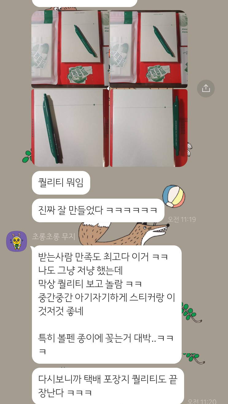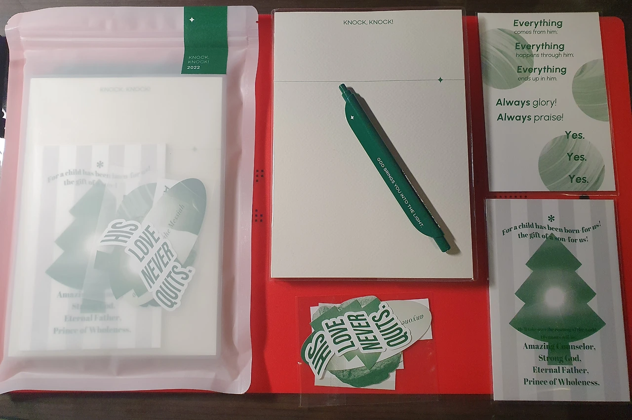 다음날 택배 발송 후, 사람들의 리뷰들이 개인 메시지와 인스타에 올라왔다. 사람마다 성향대로 다이어리를 이해하고 만지고 해석하는 게 재밌었다. 누군가는 초록색인 우리 다이어리를 돋보이게 하기 위해 배경이 빨간 곳에 가지런히 놓고 사진을 찍기도 했고(이 누군가는 글 끝에 밝혀짐), 누군가는 수록된 스티커를 자녀에게 뺏겨 다이어리를 꾸밈 당하고 자녀 품에 안긴 다이어리를 올리기도 했다. 서로 인스타 댓글로만 연락하고 실질적(?) 연락은 자주 하지 않던 초등학교 동창, 중학교 때 교회 오빠 이런 추억의 인물들도 후원 후기를 보내왔다. 덕분에 명절에 고향에서 만나자는 덕담도 나누었다.