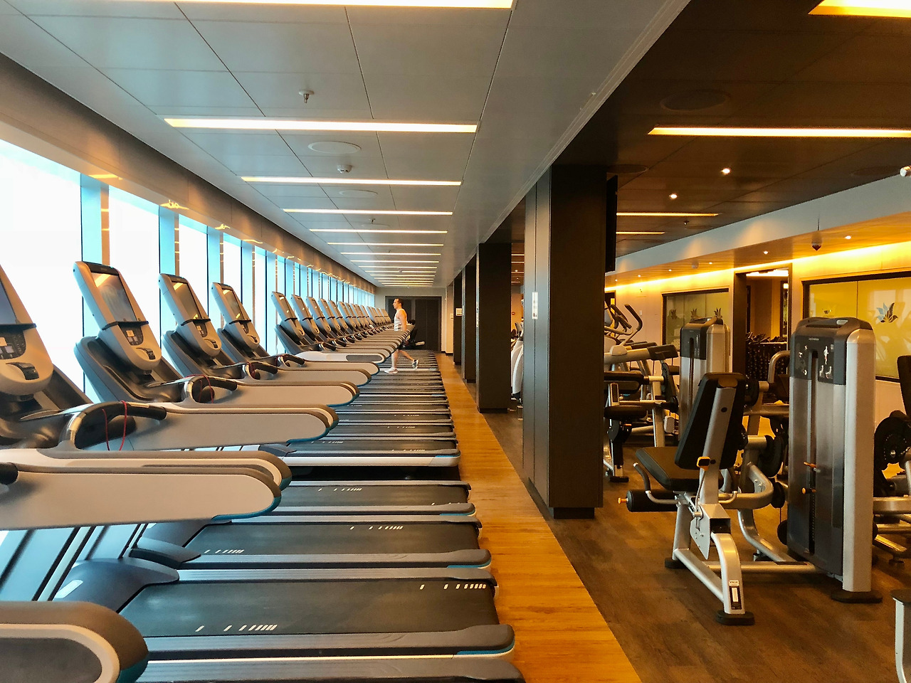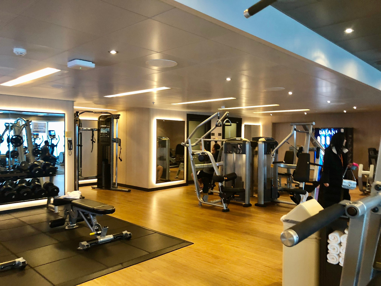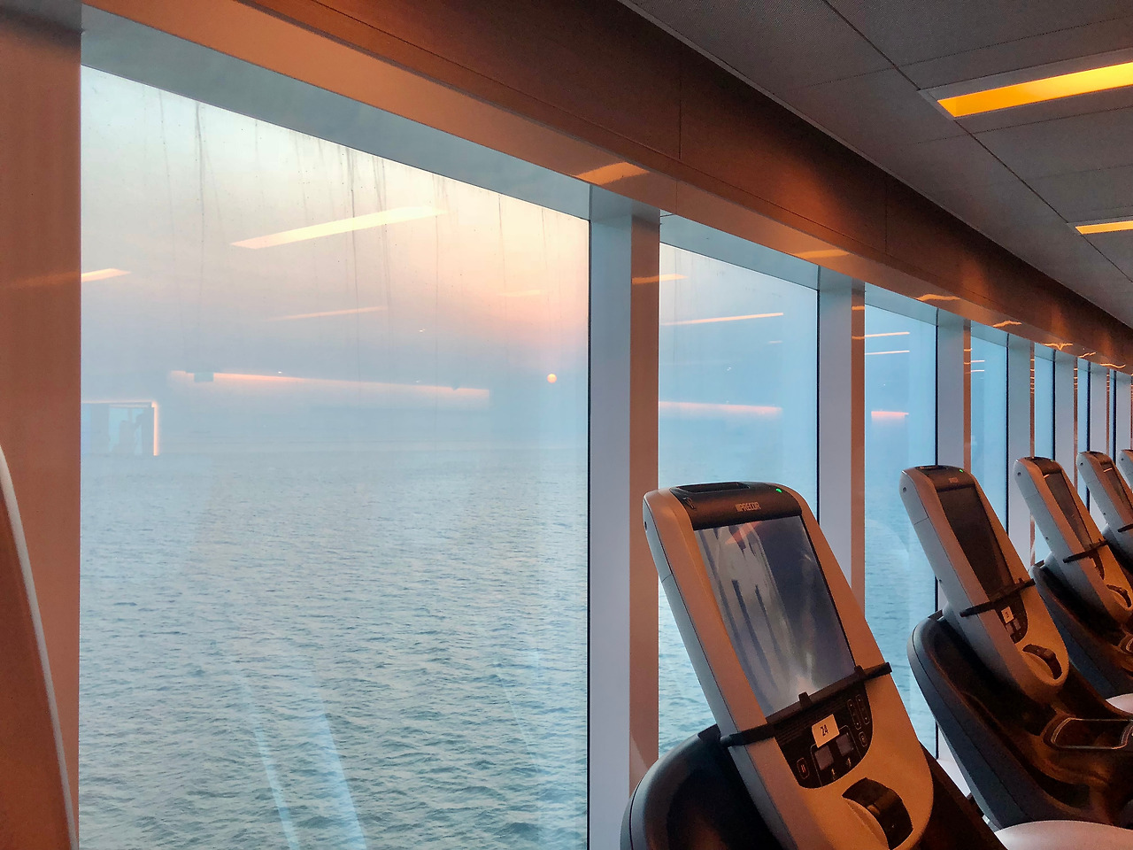 승무원 전용 헬스장과는 비교도 안 될 정도로 좋은 장비가 가득한 승객 전용 헬스장에 나는 또 한 번 놀랐다. 승선 초기에 선내 투어를 하였으나 무의식적으로 헬스장을 이용하게 될 줄 몰랐기 때문인지도 모르겠다. 매일 교체되는 깨끗한 수건과 목을 축일 수 있는 작은 개수대 그리고 다양한 장비와 신나는 음악까지. 운동을 좋아하는 사람들에겐 분명 여기가 천국일 것이리라.