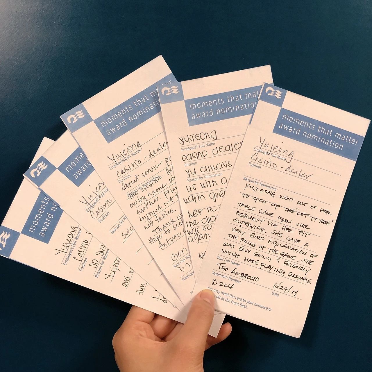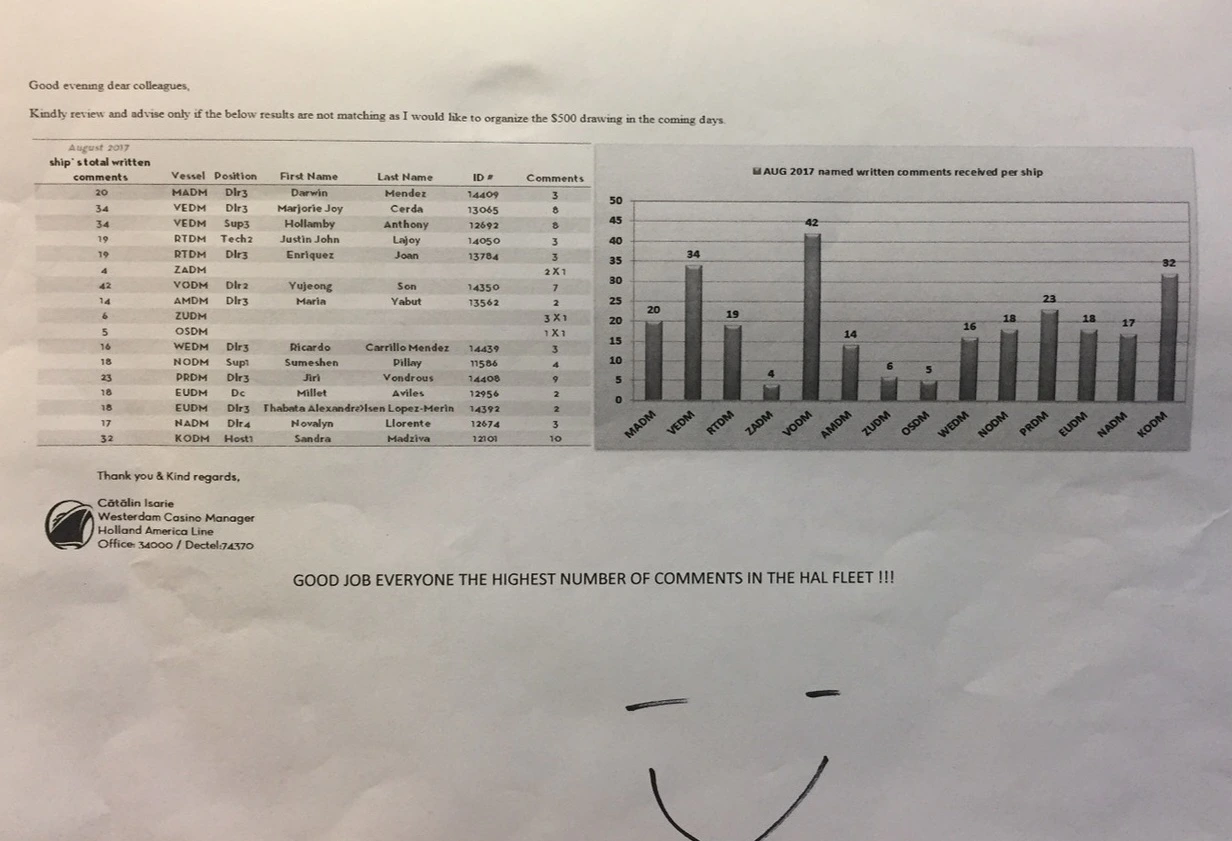 *캐빈 스튜어드가 승객들의 캐빈을 청소하면서 탁자나 침대 위에 놓인 코멘트 카드를 발견하게 되면 시간 날 때 프런트 데스크 직원에게 전달하는데, 이때 수집된 코멘트 카드를 부서별로 분류하여 집계 후 각 부서의 매니저에게로 전달한다.