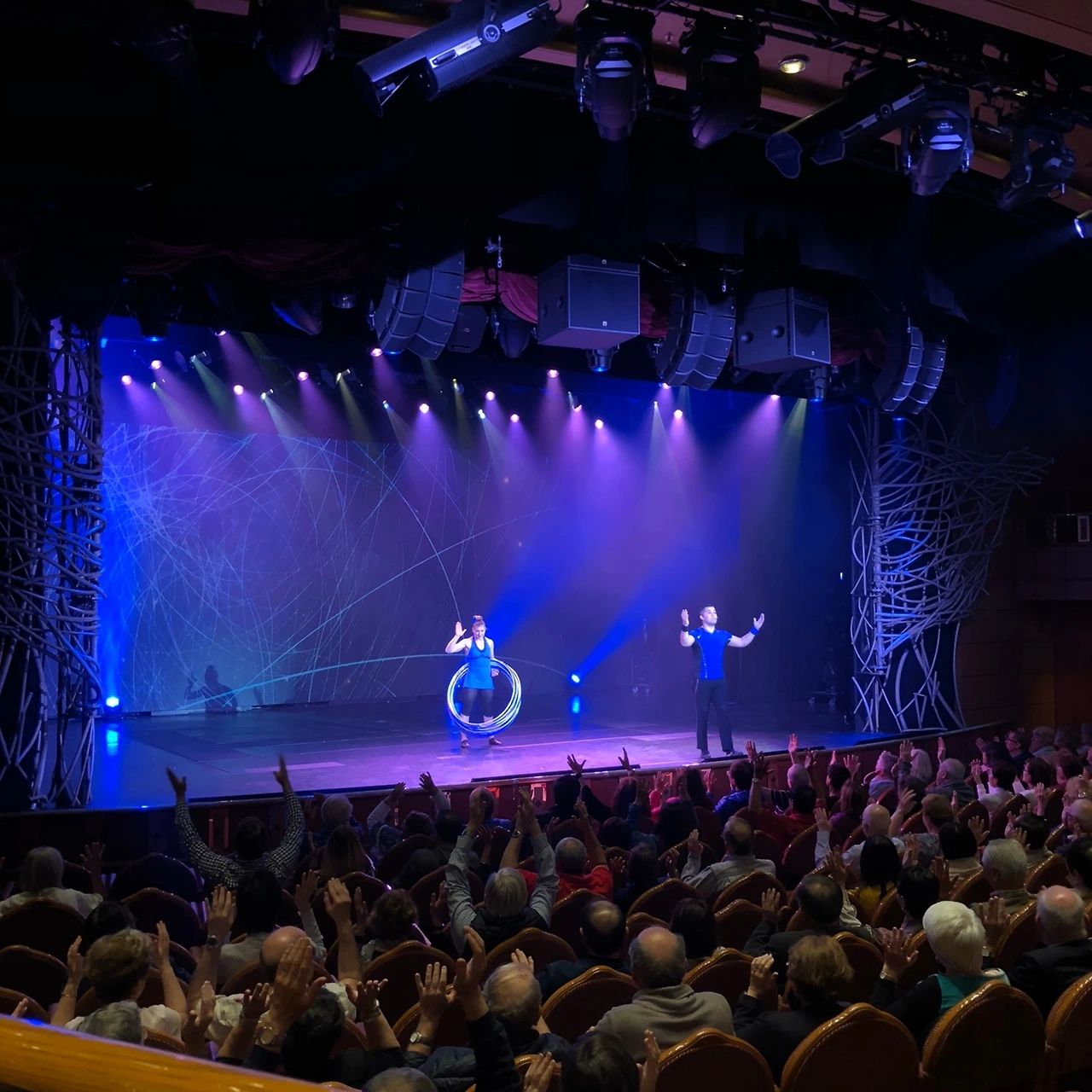 그중 뭐니 뭐니 해도 크루즈 선내의 가장 큰 볼거리이자 승객들의 이목을 단번에 끄는 건 다름 아닌 쇼(show)가 아닐까. 크루즈에는 암벽등반, 아이스 스케이팅, 수영장, 범퍼카, 워터 슬라이드, 짐(gym), 가라오케, 스파, 빙고, 시네마, 카지노 등의 시설이 갖추어져 있지만, 다수의 인원이 한 공간에서 한 곳을 응시하며 무언가를 즐기는 건 바로 이곳 극장에서만 가능하기 때문이다. 그렇기에 게스트 엔터테인먼트(Guest Entertainment) 부서의 크루들은 수십 명의 관중들 앞에서 떨지 않을 담력과 대중성, 그리고 의심의 여지없는 실력을 고루 갖추고 있어야 한다.