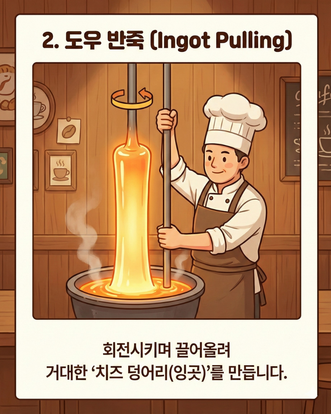 녹인 치즈를 막대기로 천천히 회전시키며