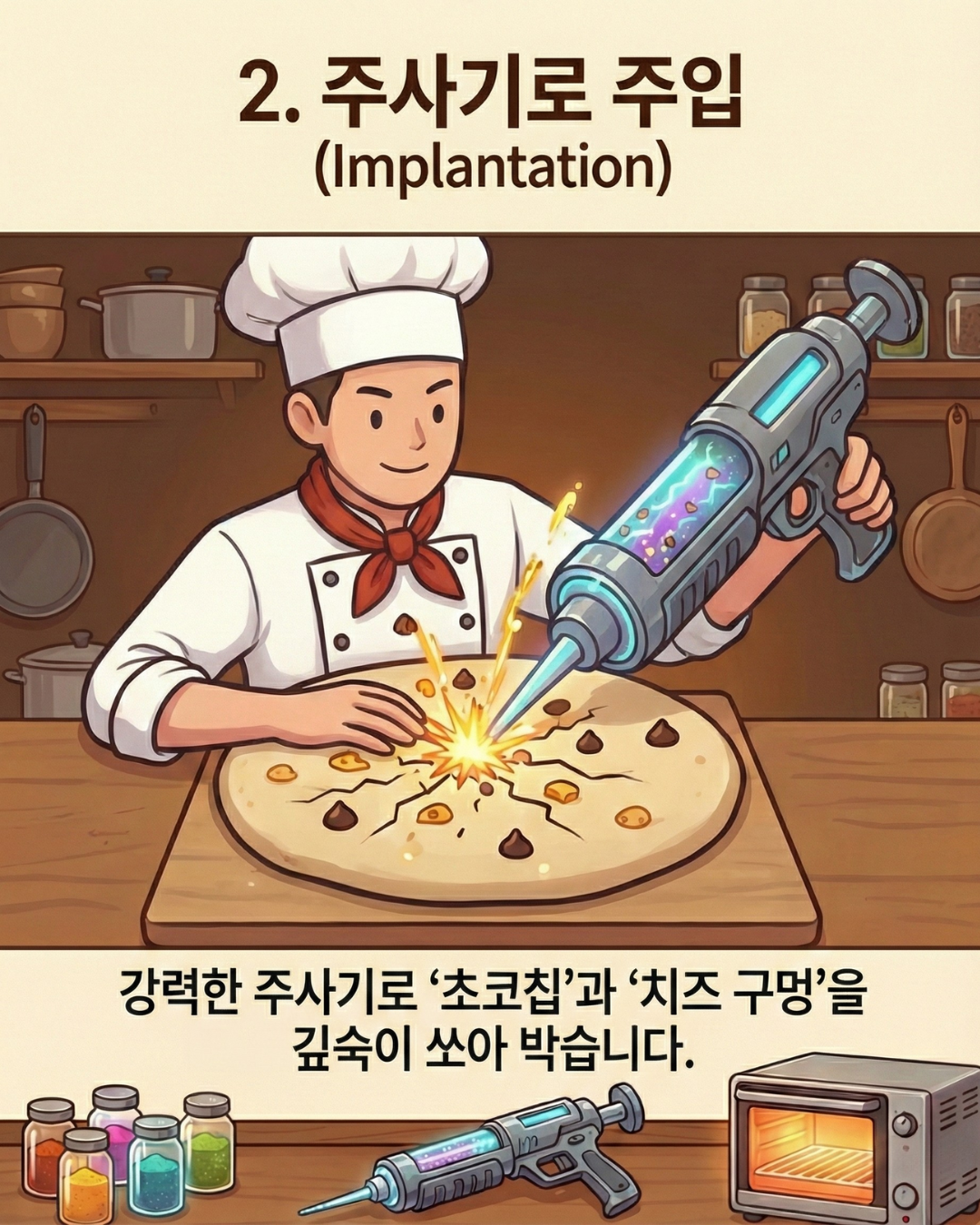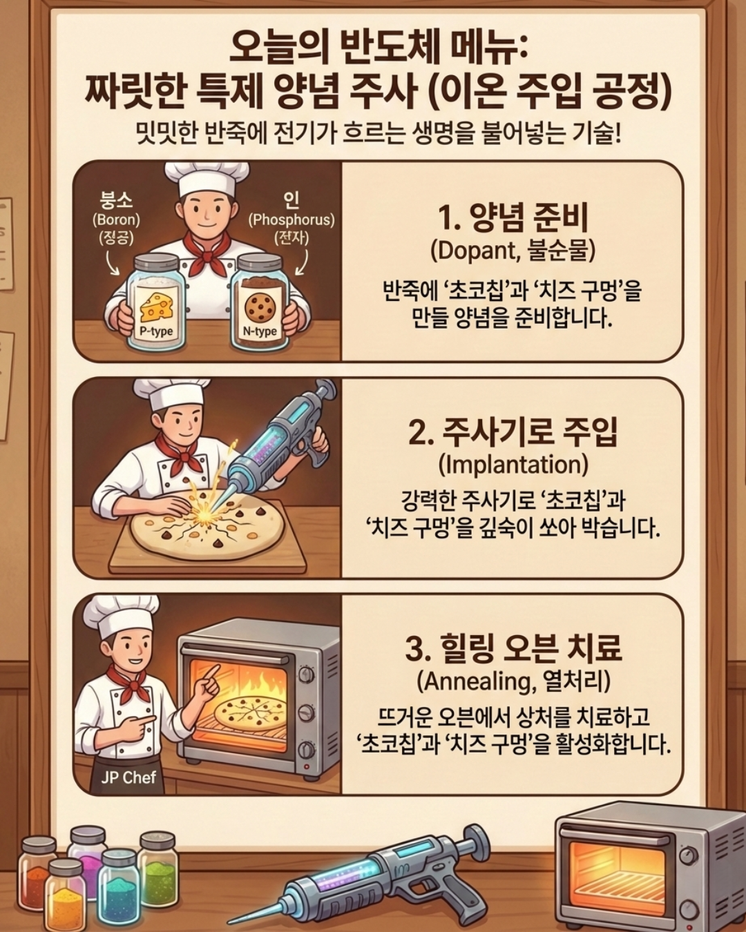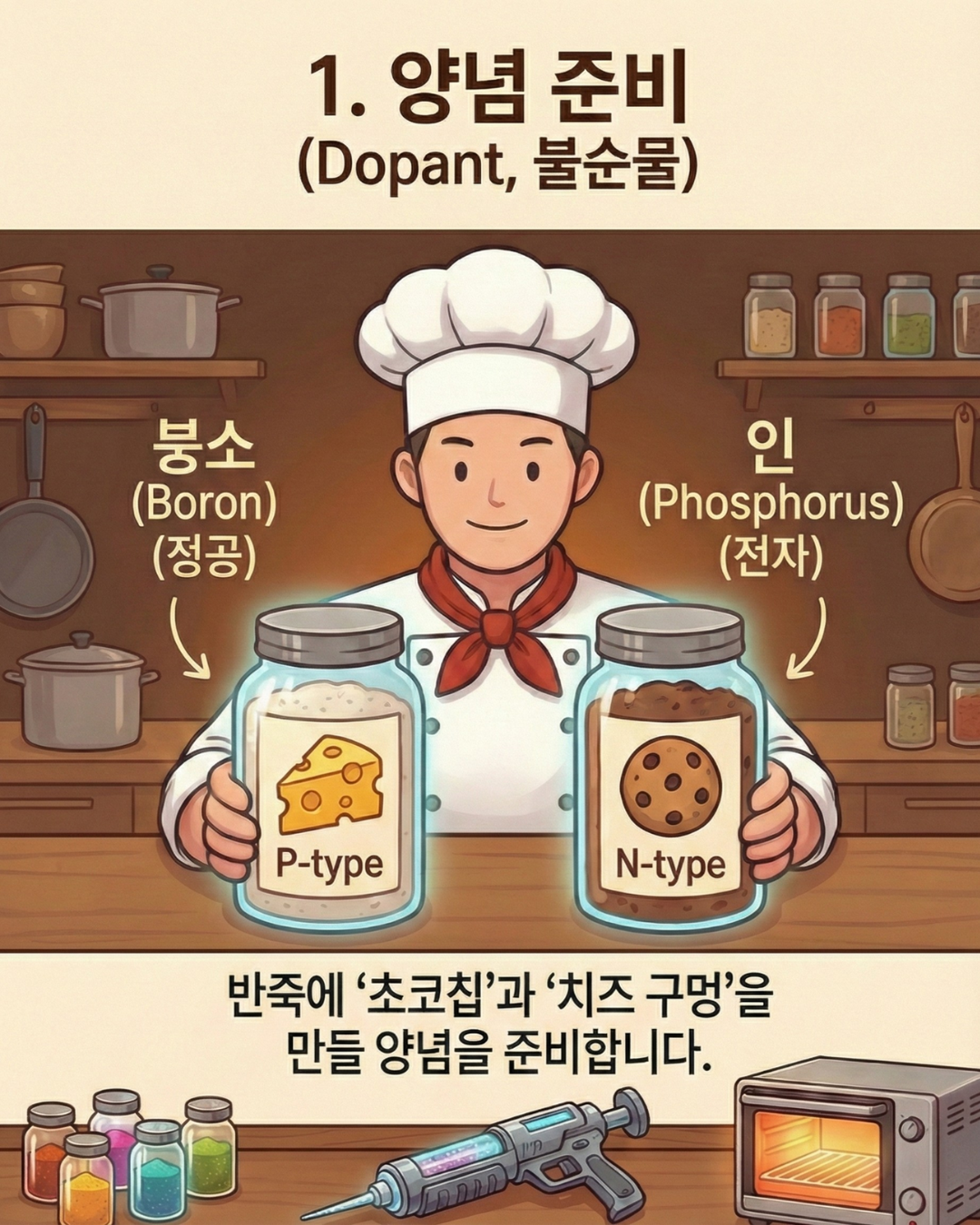 . 인(Phosphorus) 투입: 반죽 속에 초코칩(전자)을 잔뜩 만들어 에너지를 줍니다. (N형)
