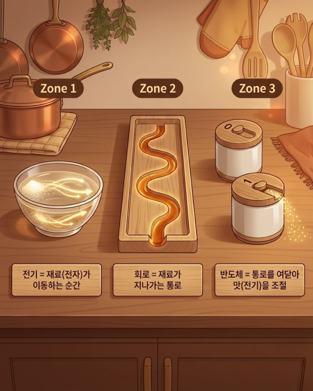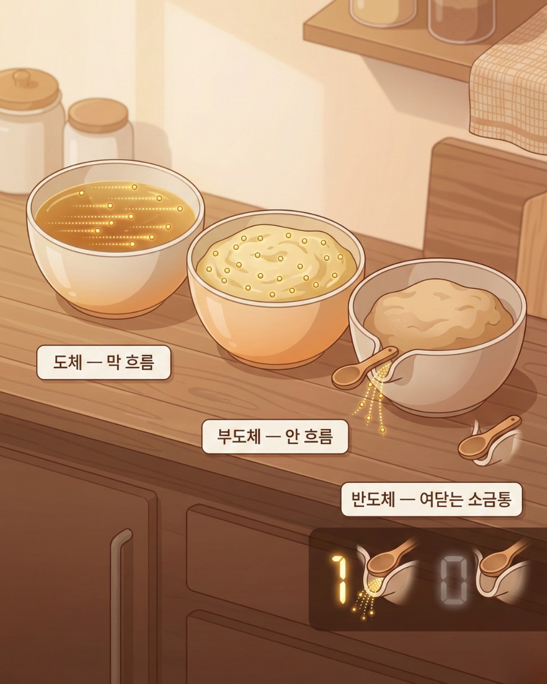 도체(구리선): 뚜껑이 열려버린 소금통입니다. 쏟아집니다. (통제가 안 됨)