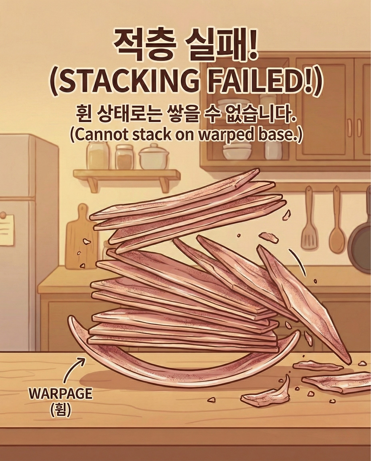 반도체에서는 이걸 워피지(Warpage, 휨)라고 부릅니다.