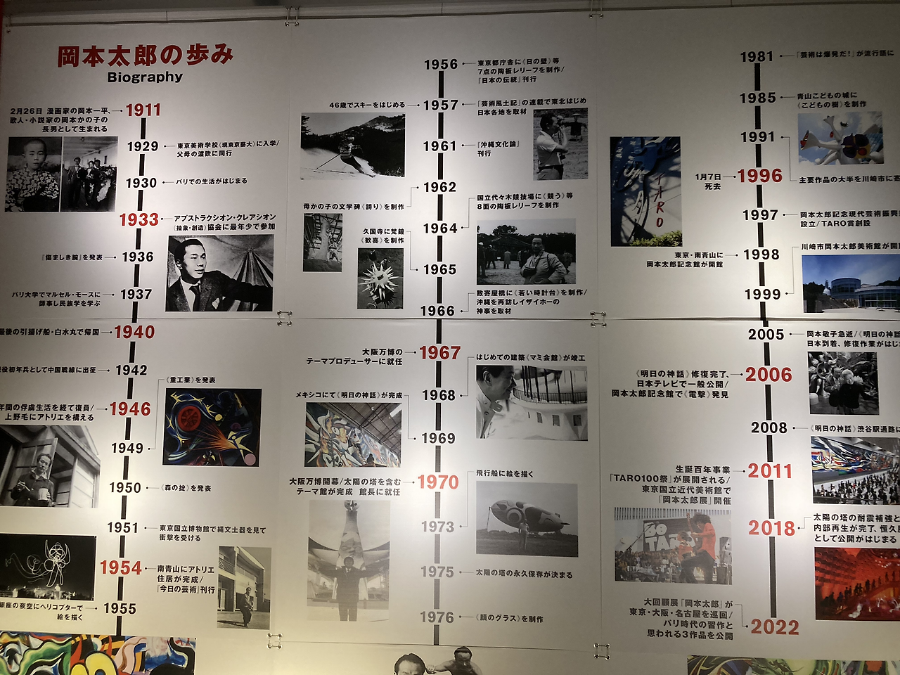 1911년에 태어난 오카모토 타로는 미술관에 걸려있는 그의 유년기 시절을 보았을 때 금수저 집안에서 태어난 것으로 보인다. 그는 18세 경 프랑스 파리로 예술 공부를 위해 유학을 하고, 그때 피카소의 영향을 상당히 많이 받게 된다.