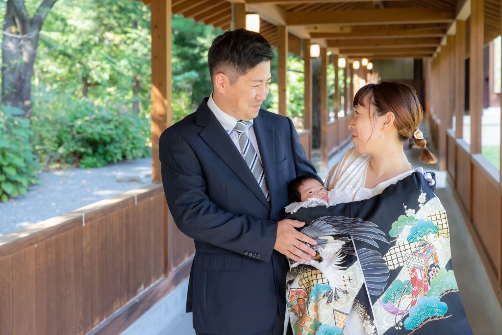 먼저 태어난 지 30일이 지나면 갓난아이와 함께 첫 신사 참배를 다녀오는데, 이를 오미야마이리(お宮参り)라 부른다. 신사에 모셔진 신에게 아이가 태어난 것을 신고하는 것과 동시에 아이가 살게 될 지역사회에 새로운 공동체의 일원이 태어났음을 알리는 의식이다.