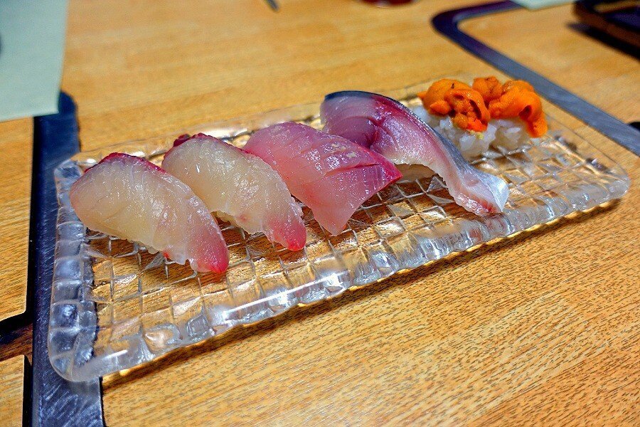 - 이곳은 기본적으로 다양한 해산물을 이용한 요리를 판매하고 있는데 가장 인기가 많은 시그니처 메뉴는 '고등어봉초밥' 입니다. 다른 가게들과 대비되는 이곳의 가장 큰 특징은 '고등어봉초밥' 을 완성하고 스시의 위에 올려주는 다시마가 일반적으로 사용하는 '백다시마' 가 아닌 '류히콘부(교토의 전통요리인 '규히마끼' 에 사용하는 다시마 중 하나로 다시마에 설탕을 바른 후 바람에 수회 건조해 만든 것)' 로 보다 더욱 간사이 지역의 특징에 맞는 봉초밥을 만들어주는 것이 특징이었습니다. 봉초밥을 제외한 일반 초밥 중에서는 '바다장어' 가 인기가 많은 편으로 지역별로 맛의 편차가 큰 '성게소' 와 함께 특정한 산지만 고집하는 특징이 있었습니다.