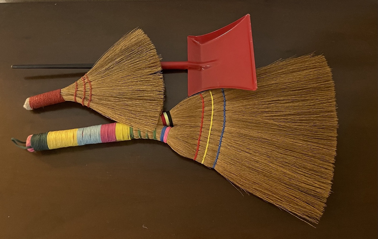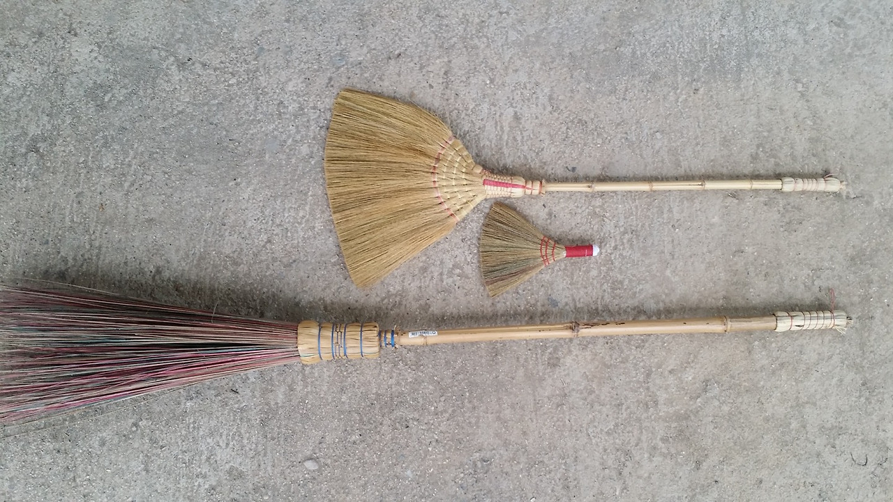 긴 대나무 손잡이를 꽂아서 만든 잘 생기고 힘이 세어 보이는 아빠마당 빗자루와 갈대 잎이 치마폭처럼 풍성하게 펼쳐진 엄마, 그 사이에 귀여운 아기 빗자루가 나란히 있는 행복한 사진이었어.