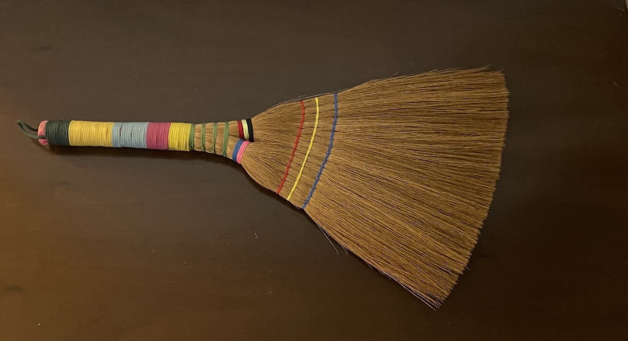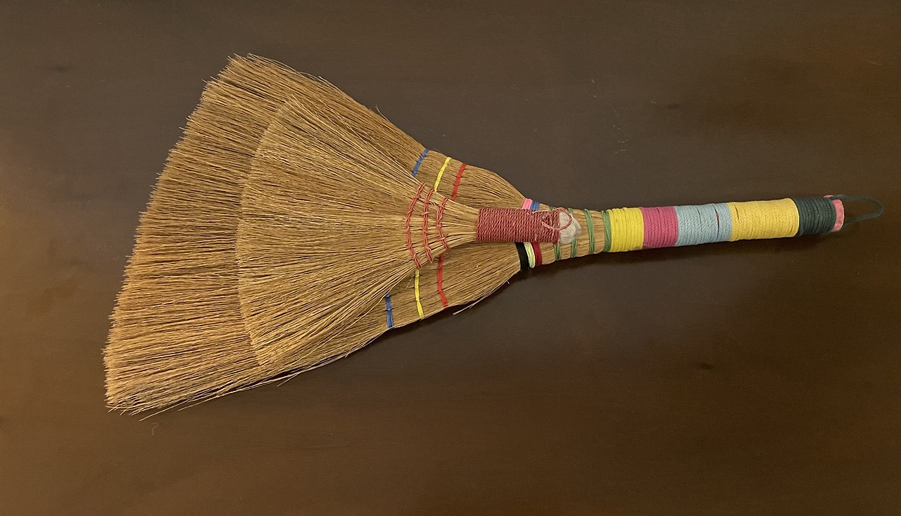 "할아버지가 갓 결혼을 했을 때 너무 가난해서 돈을 벌려고 아내와 아이들과 헤어져 살았대. 거기는 강변이라 갈대가 많았는데 아내를 위해 빗자루를 만들어서 선물해야지 맘먹었대. 갈대를 뽑을 때부터 오색 실로 빗자루를 엮을 때까지 고운 각시와 귀여운 아이들을 생각하며 만든 것이 색동 빗자루라고 했어. 그 빗자루를 받고 아내가 너무 기뻐하던 모습을 아직도 기억한다 하셨어. 사람들이 그 빗자루를 보고 감탄하며 너도 나도 주문을 했대. 그렇게 평생 빗자루를 엮어서 파는 일을 하시게 되었대. 지금도 색동 빗자루를 엮으면 언제나 그때 기뻐하던 아내를 떠 올린다고 하셨어. 나도 그렇게 만들어진 거야. "