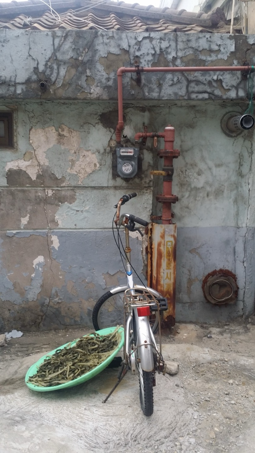 쇳덩어리 가스관에 기댄 낡은 자전거, 그 자전거에 기댄 나물 말리는 플라스틱 소쿠리.