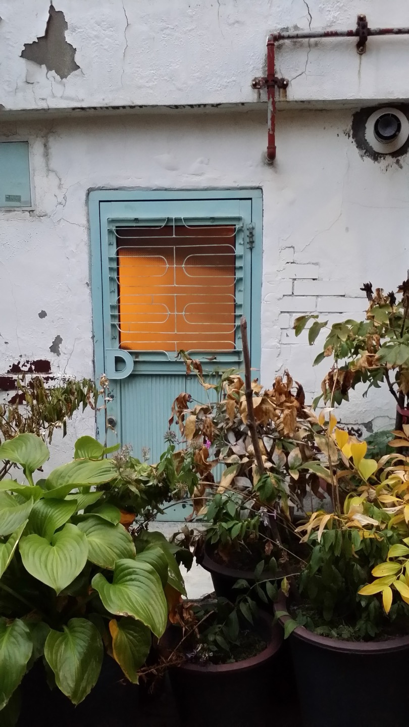 창살이 예쁜 하늘색 작은 문에 불이켜지고 집 앞에는 아직 시들지 않은 화분들.